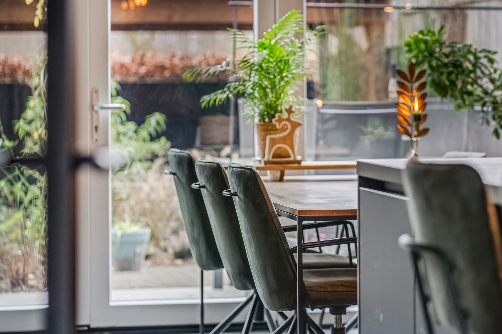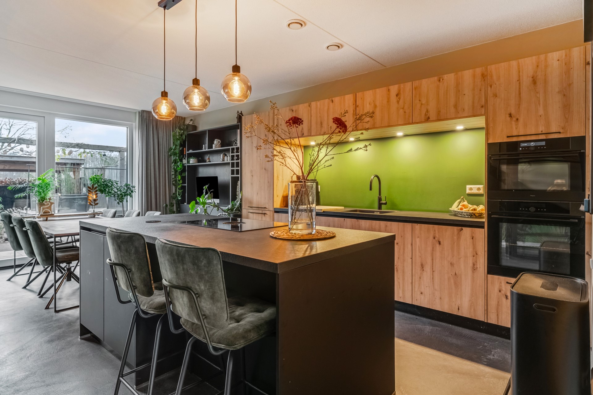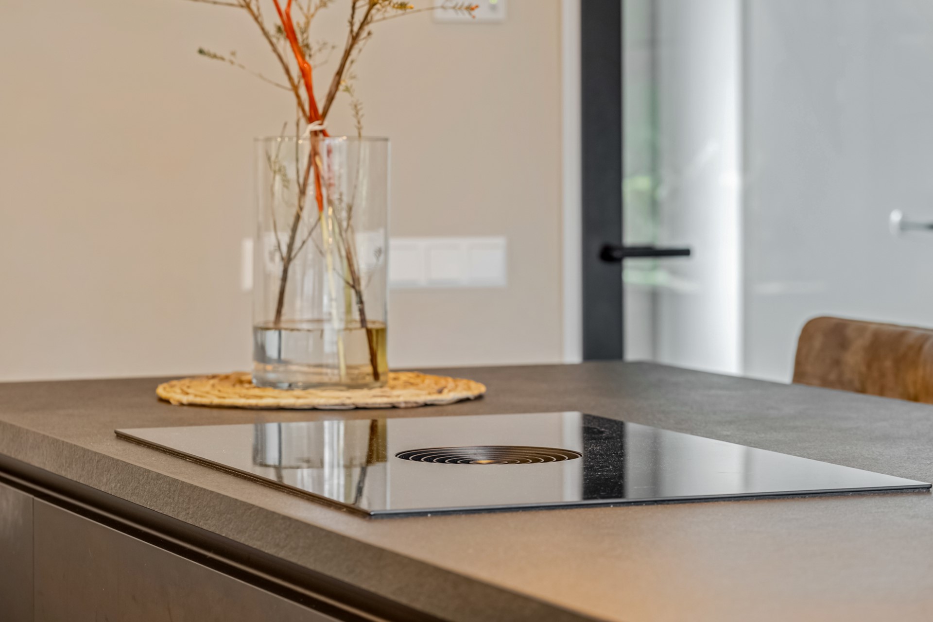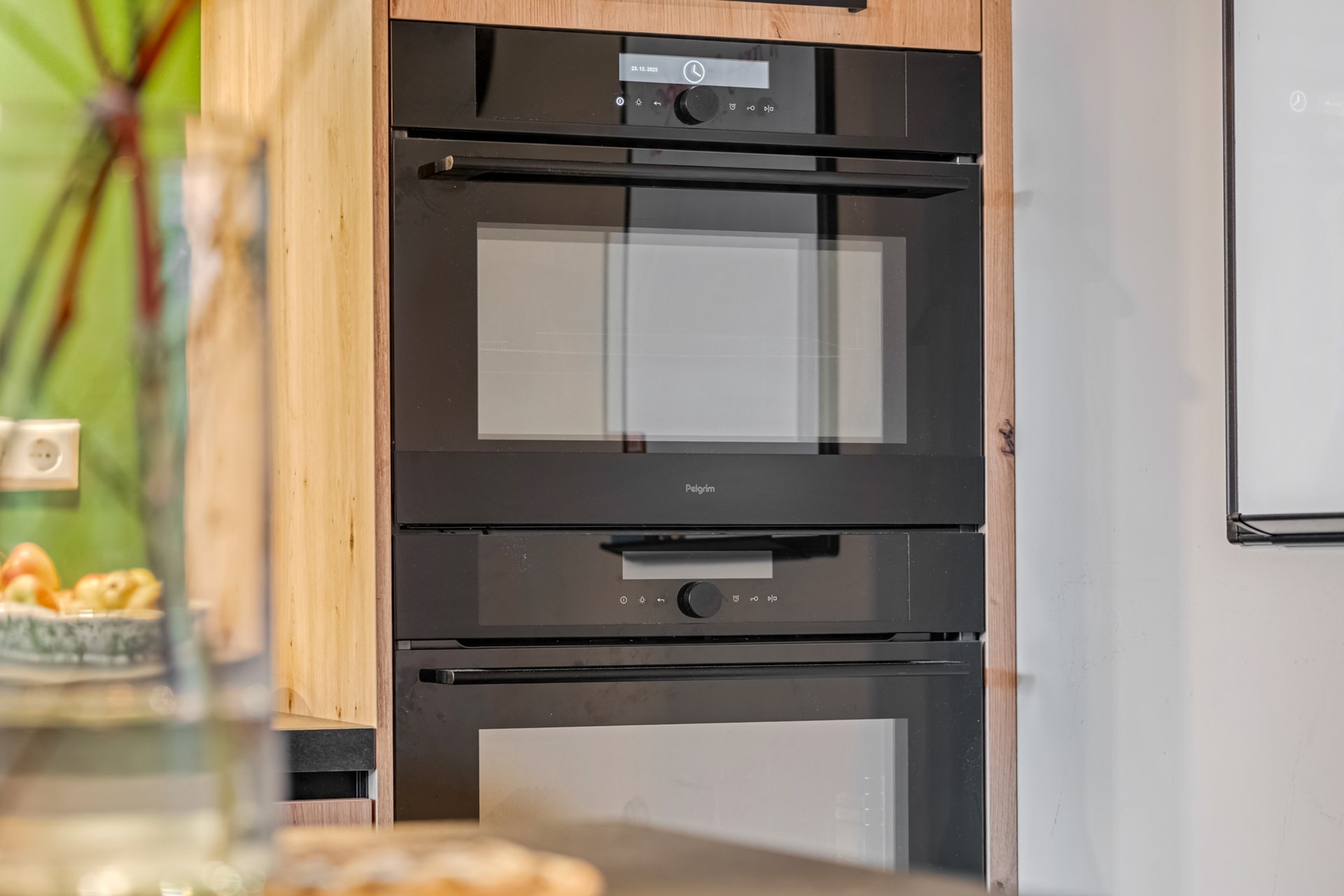 De woonkeuken vormt het hart van de woning en biedt volop ruimte om comfortabel te dineren en samen te zijn met gezin en familie. De keuken is voorzien van een kook- en spoeleiland met inductiekookplaat en geïntegreerde afzuiging, een Quooker voor kokend water en diverse inbouwapparatuur, waaronder een koelkast, vaatwasser, combi-oven en separate oven. Via de openslaande deuren is er direct toegang tot de tuin.