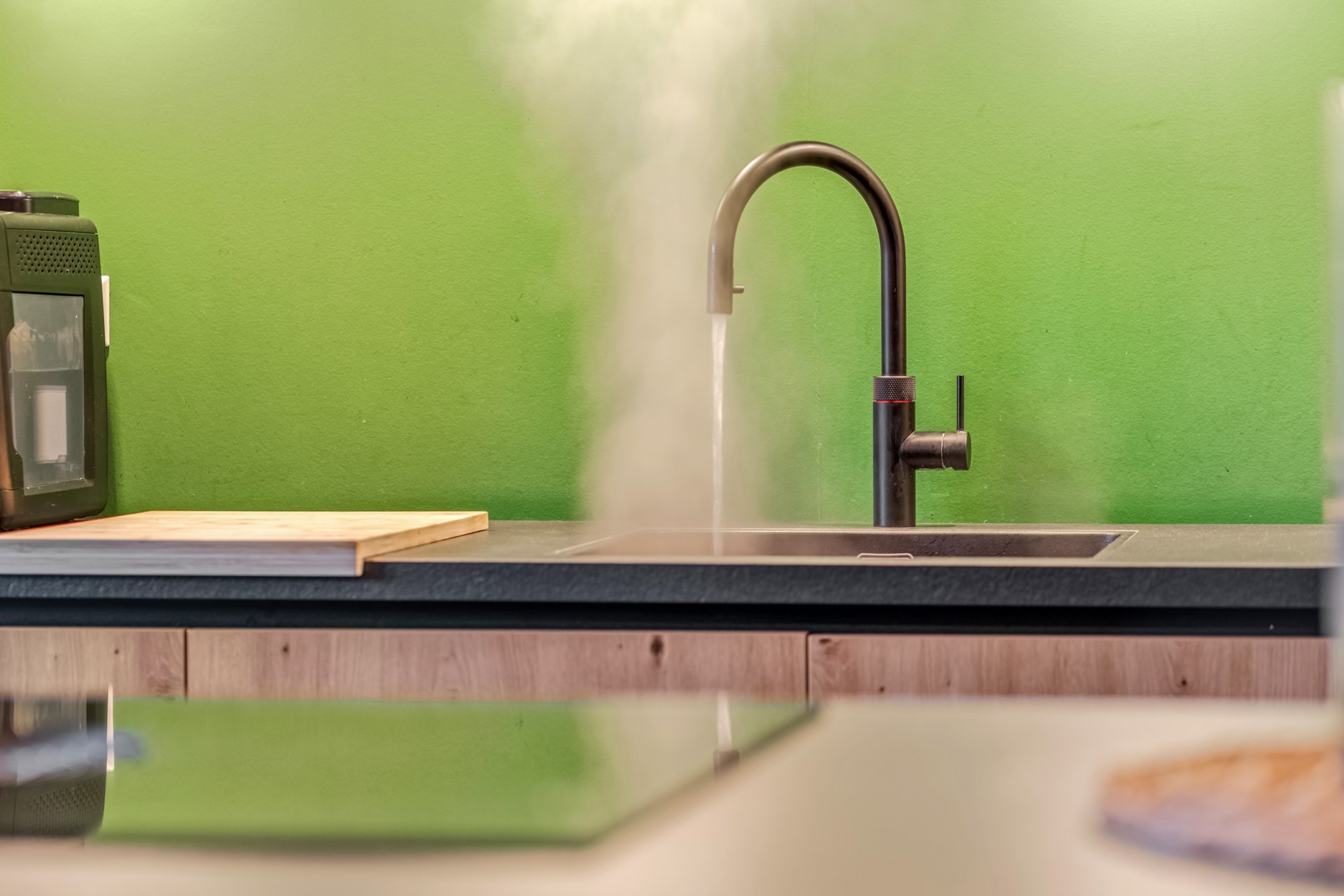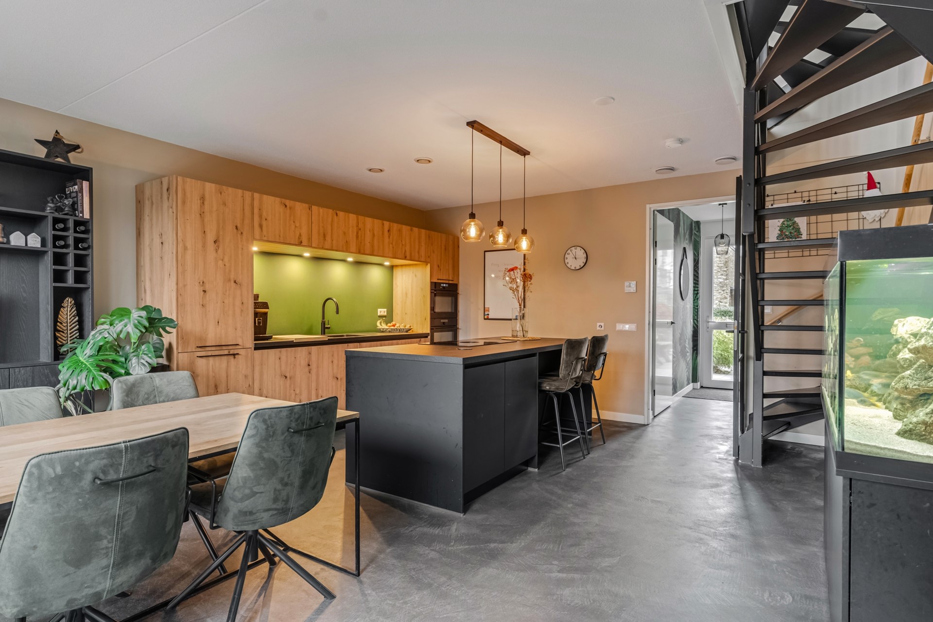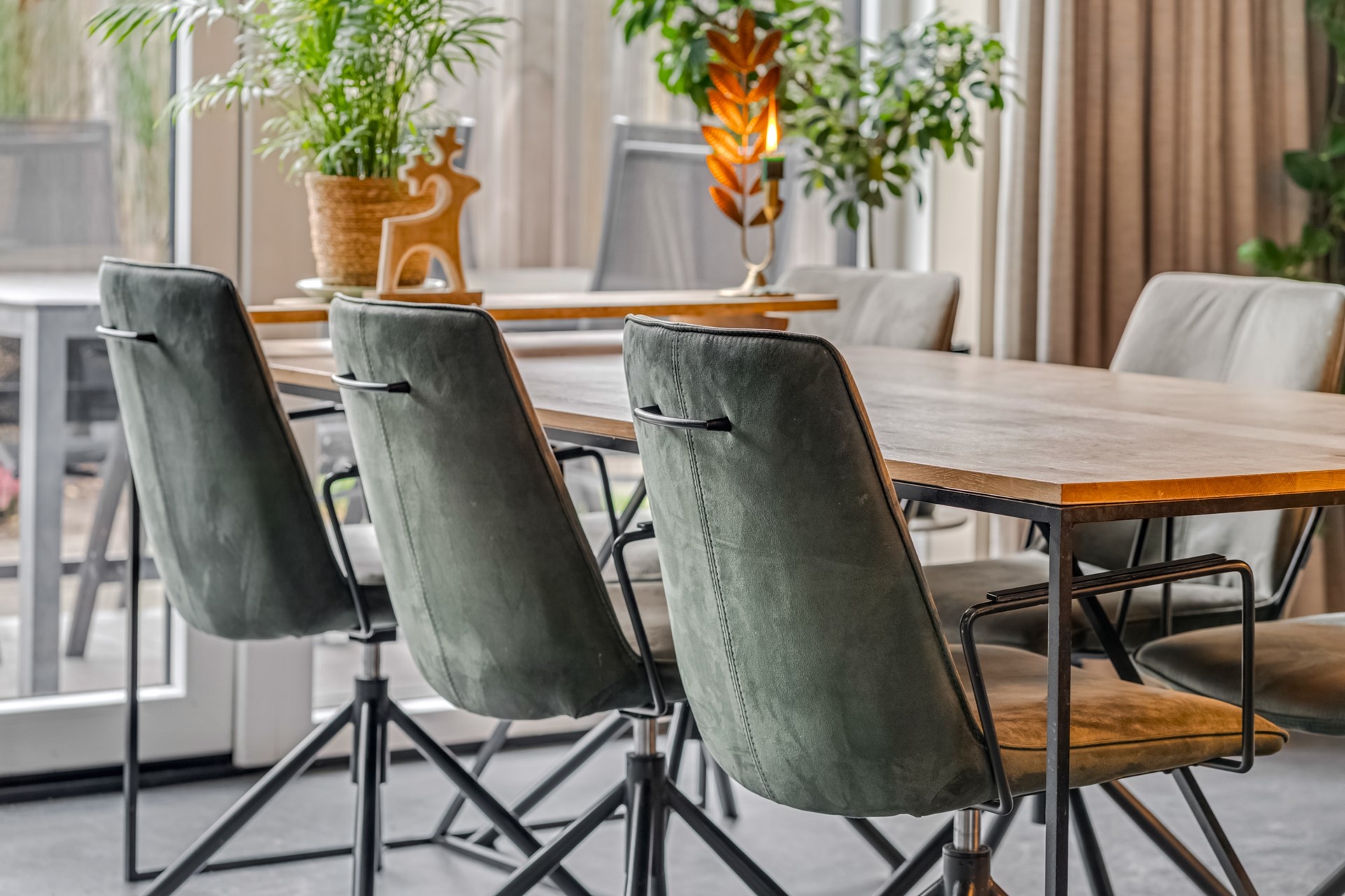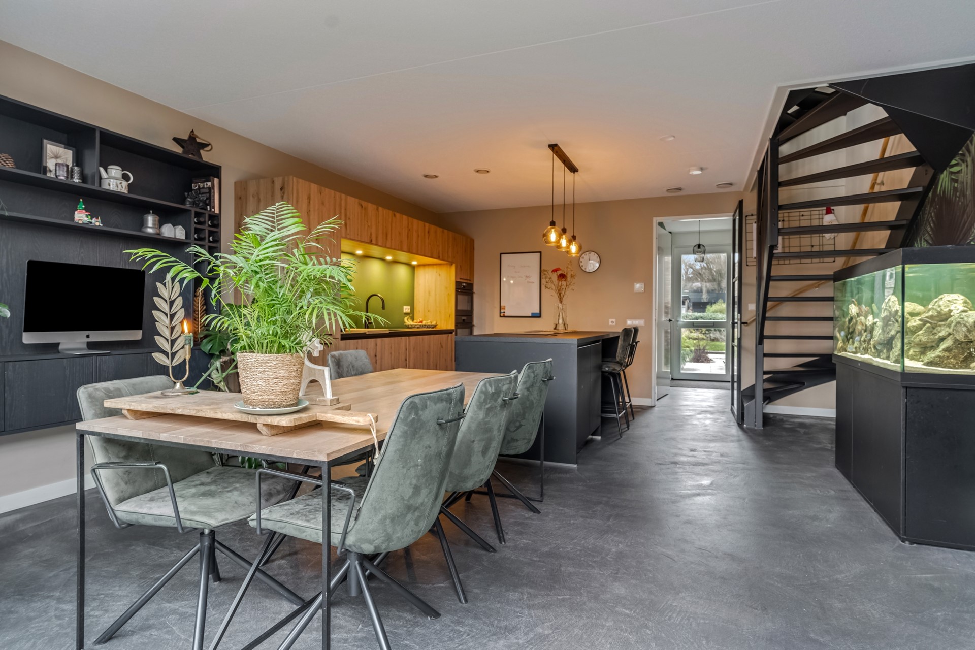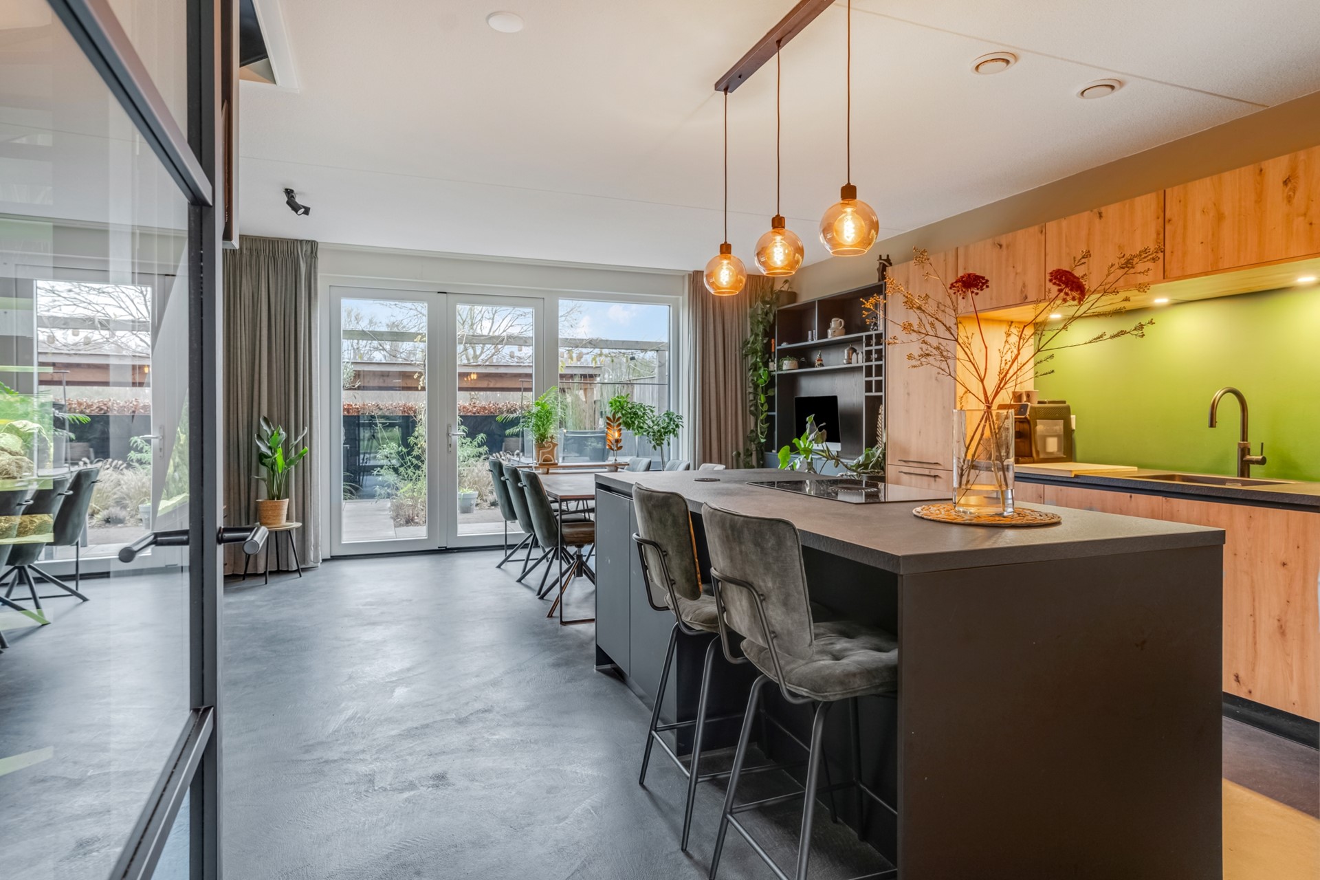 De woonkeuken vormt het hart van de woning en biedt volop ruimte om comfortabel te dineren en samen te zijn met gezin en familie. De keuken is voorzien van een kook- en spoeleiland met inductiekookplaat en geïntegreerde afzuiging, een Quooker voor kokend water en diverse inbouwapparatuur, waaronder een koelkast, vaatwasser, combi-oven en separate oven. Via de openslaande deuren is er direct toegang tot de tuin.