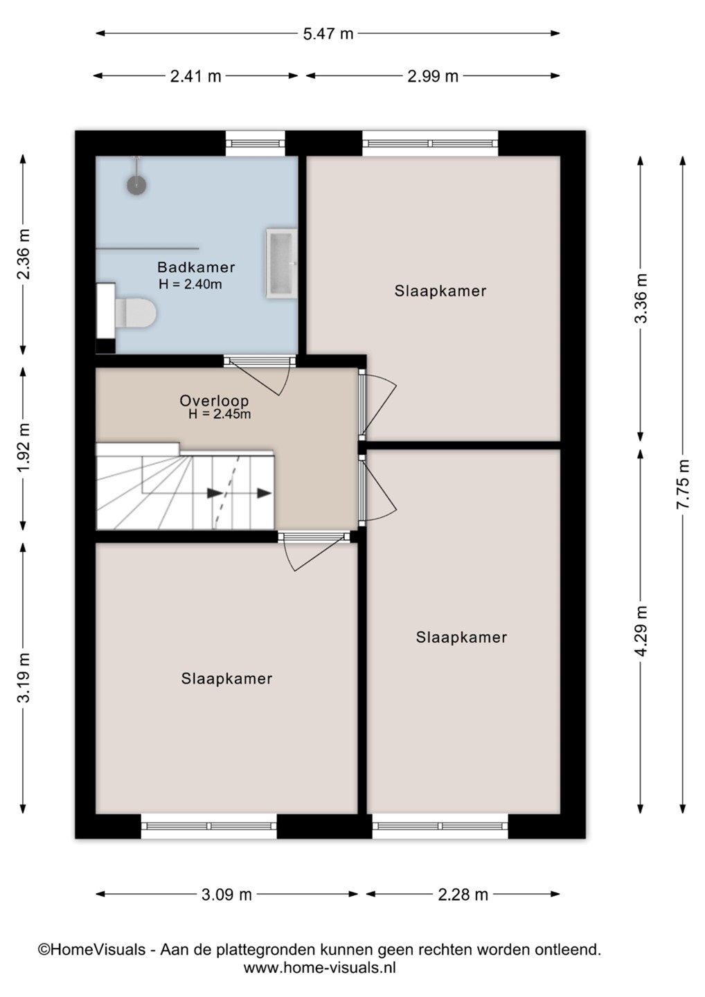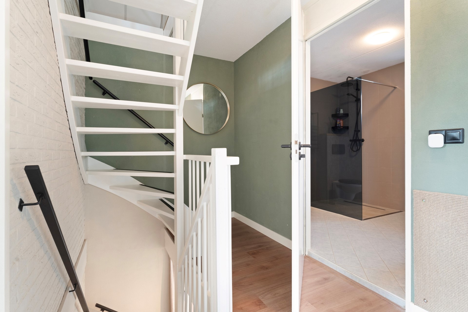 Overloop met toegang tot drie slaapkamers en de badkamer. De badkamer is voorzien van een inloopdouche, toilet en wastafelmeubel.