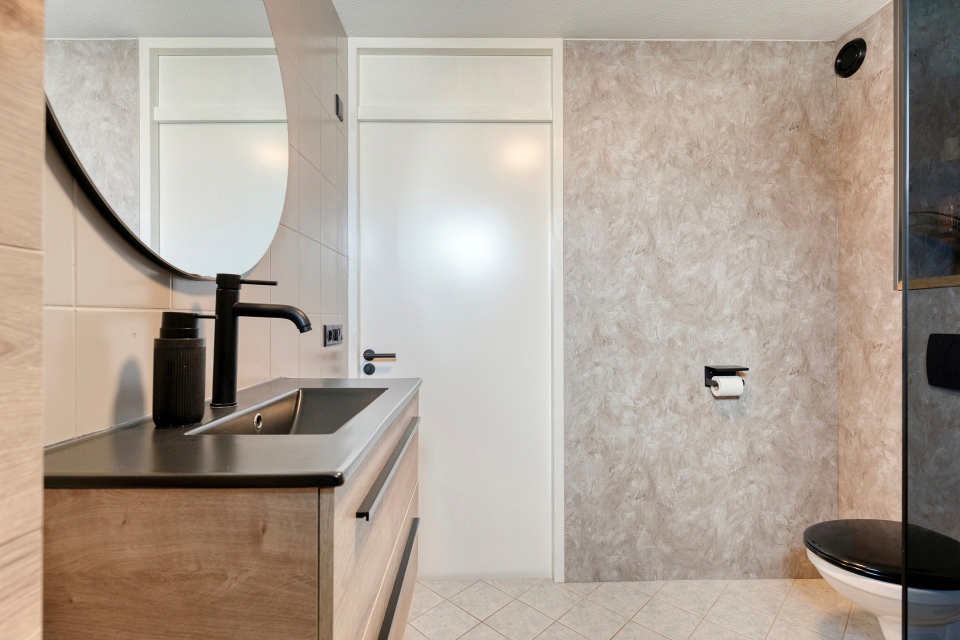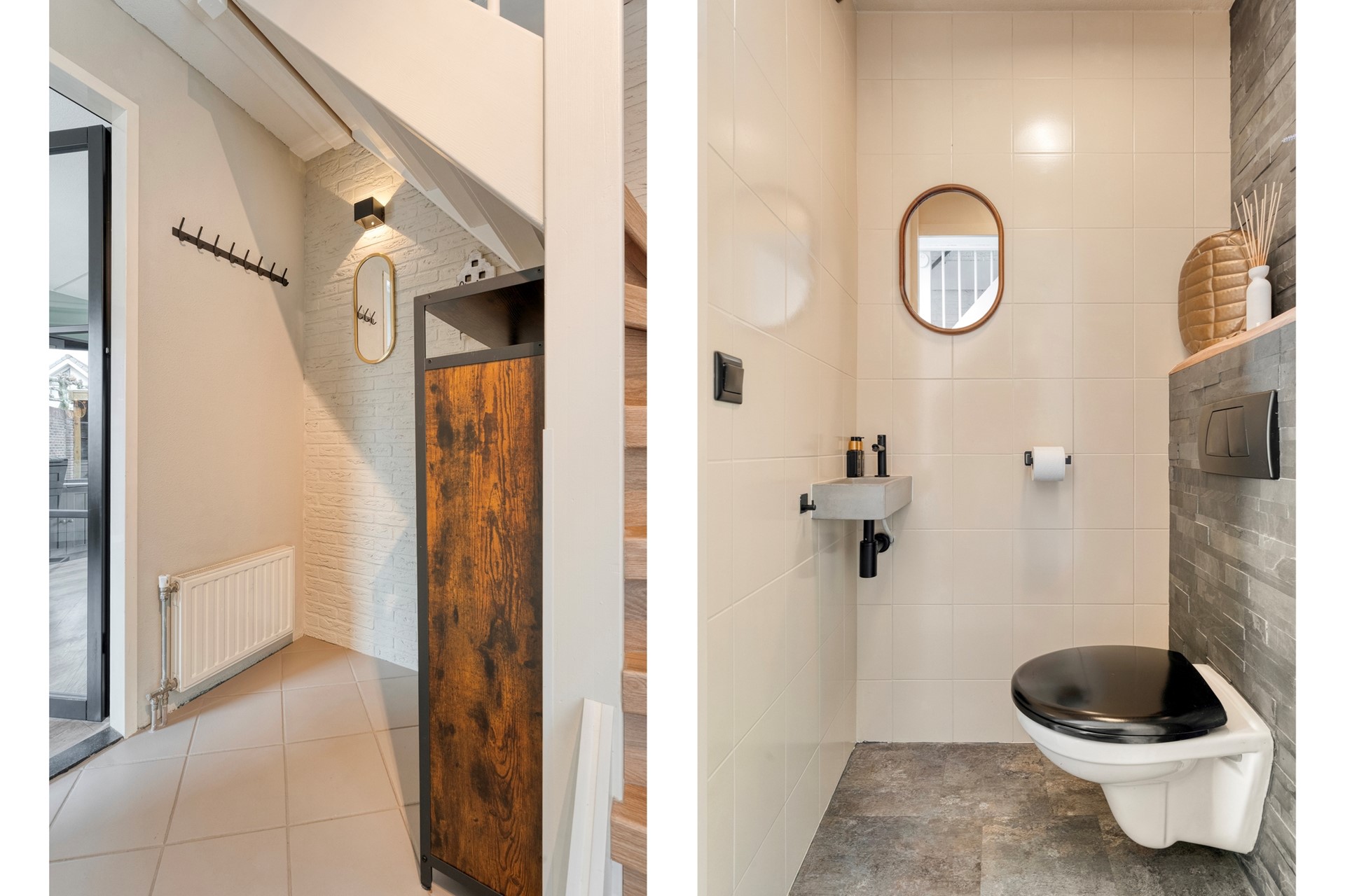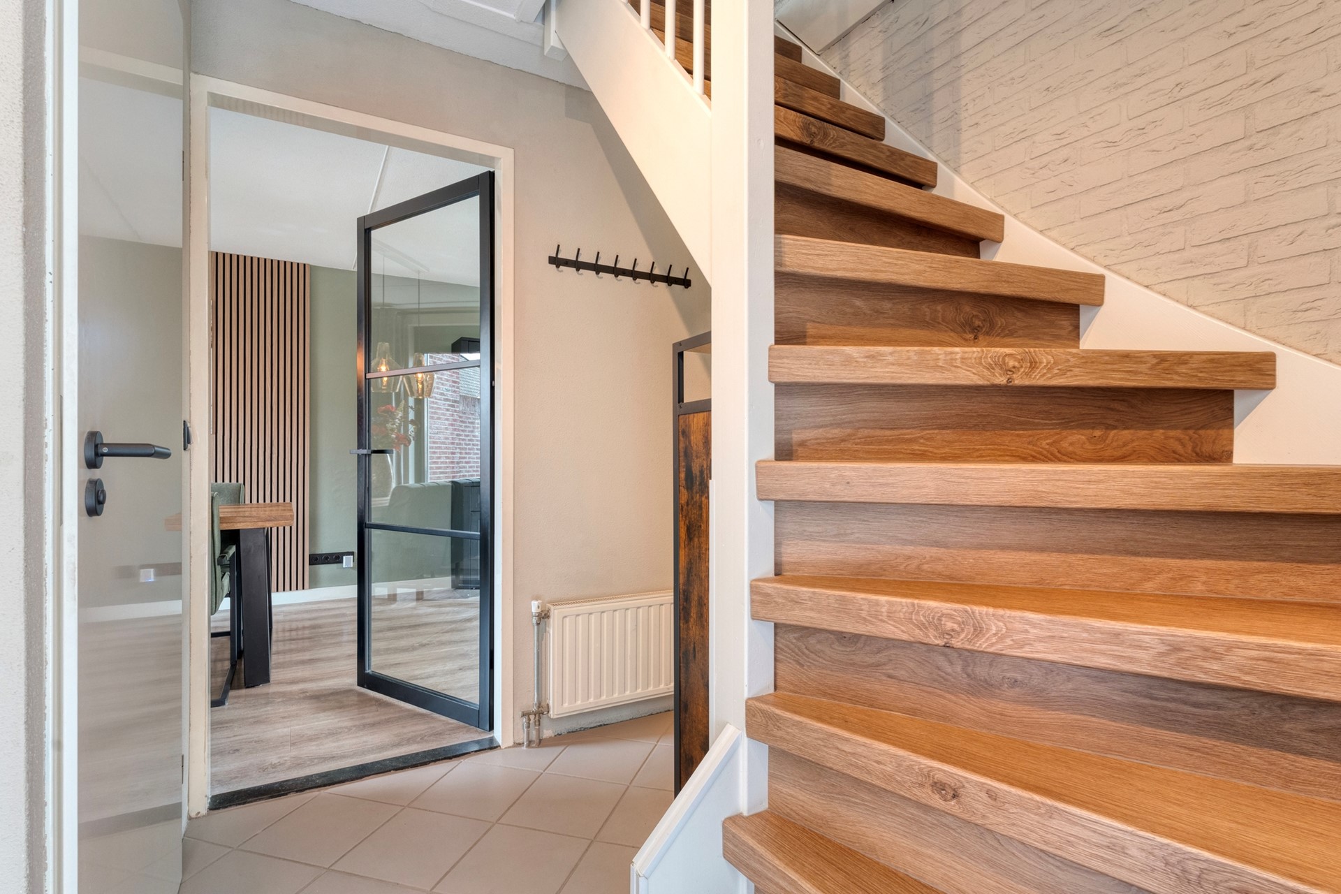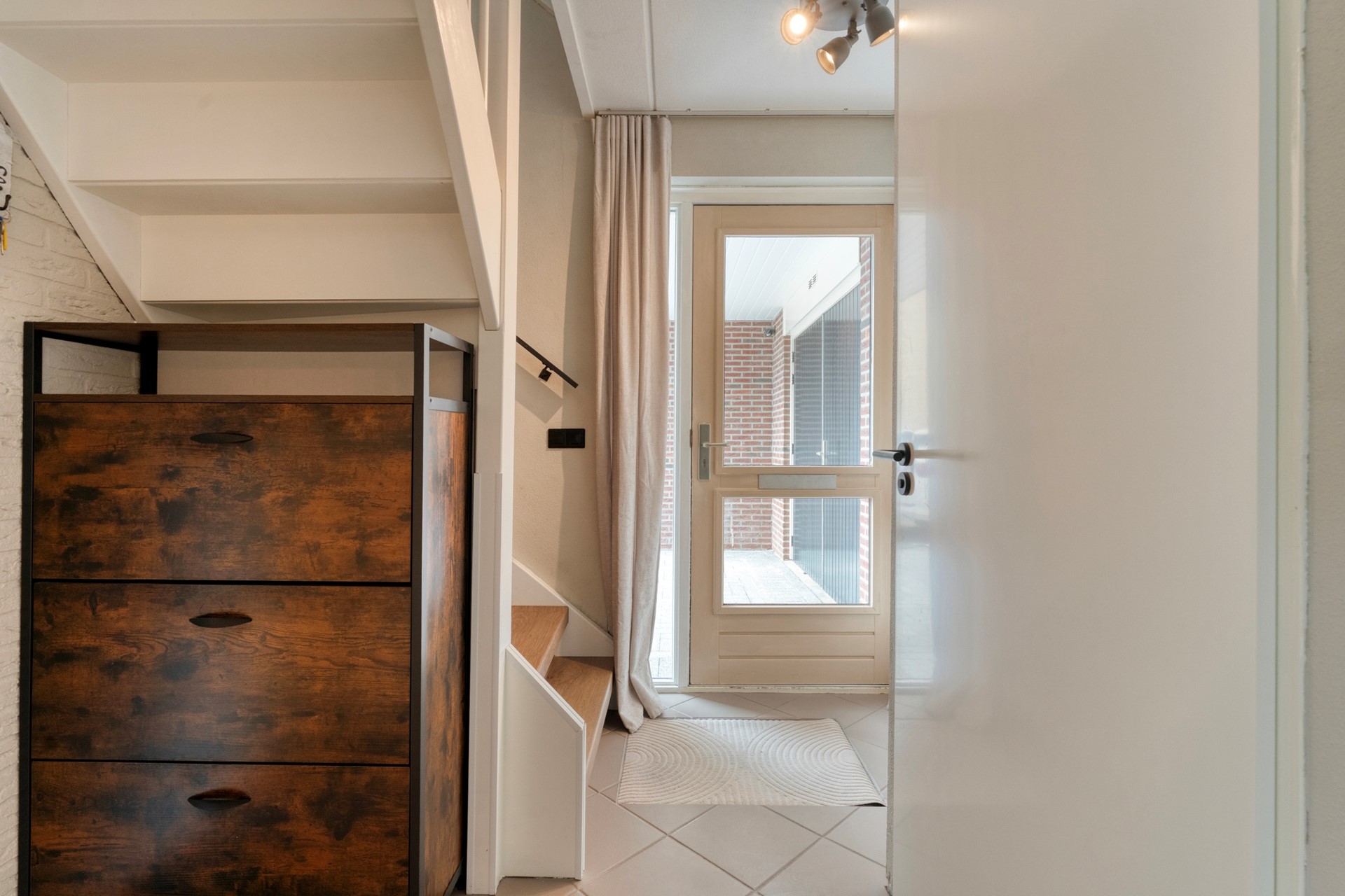Entree met trapopgang naar de eerste verdieping. In de hal bevinden zich de meterkast en een modern toilet met fontein. Vanuit de hal kom je via een deur met glas in de lichte woonkamer, wat zorgt voor een mooie open verbinding. Hier is een fijne zithoek gecreëerd waar je heerlijk kunt ontspannen na een lange dag.