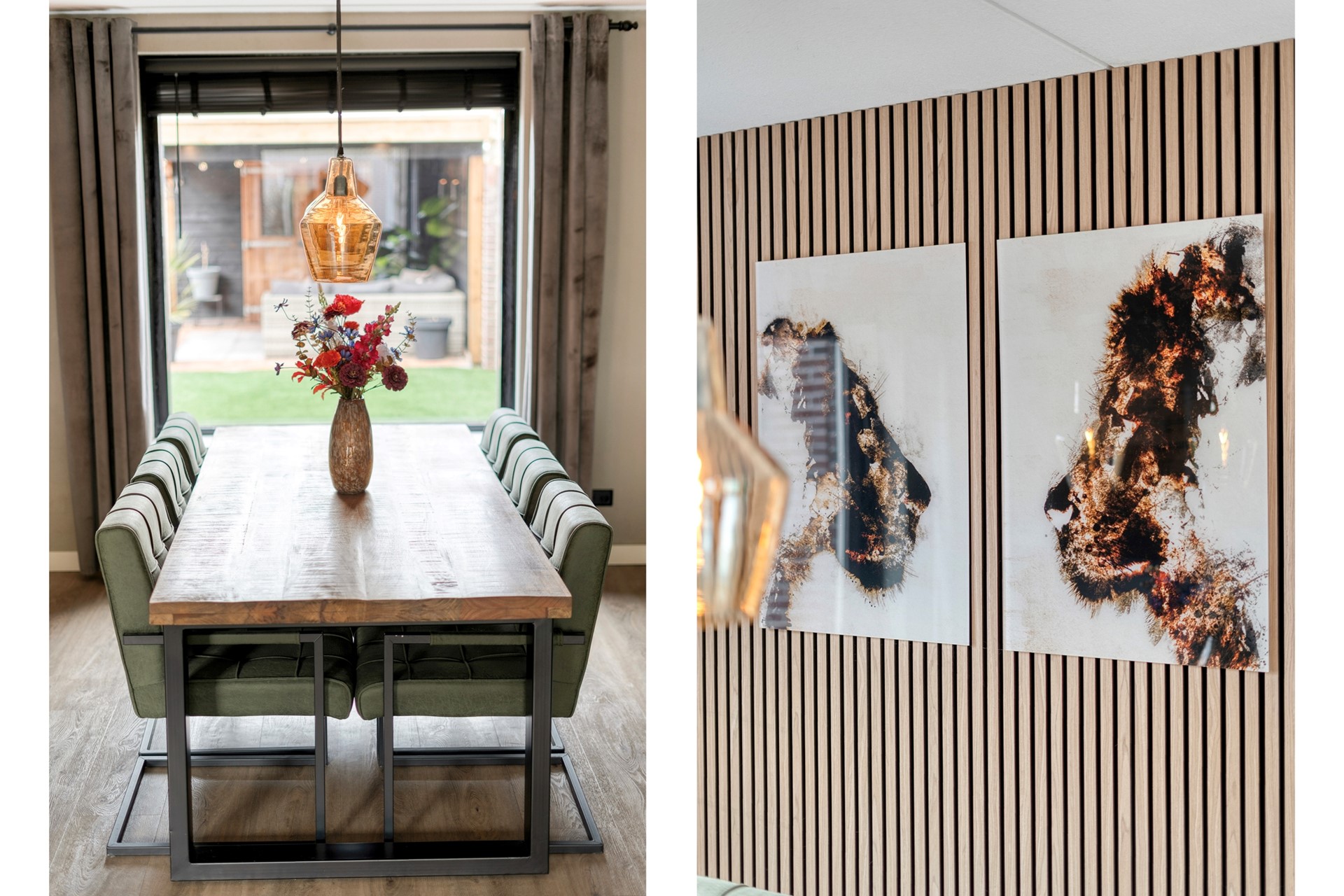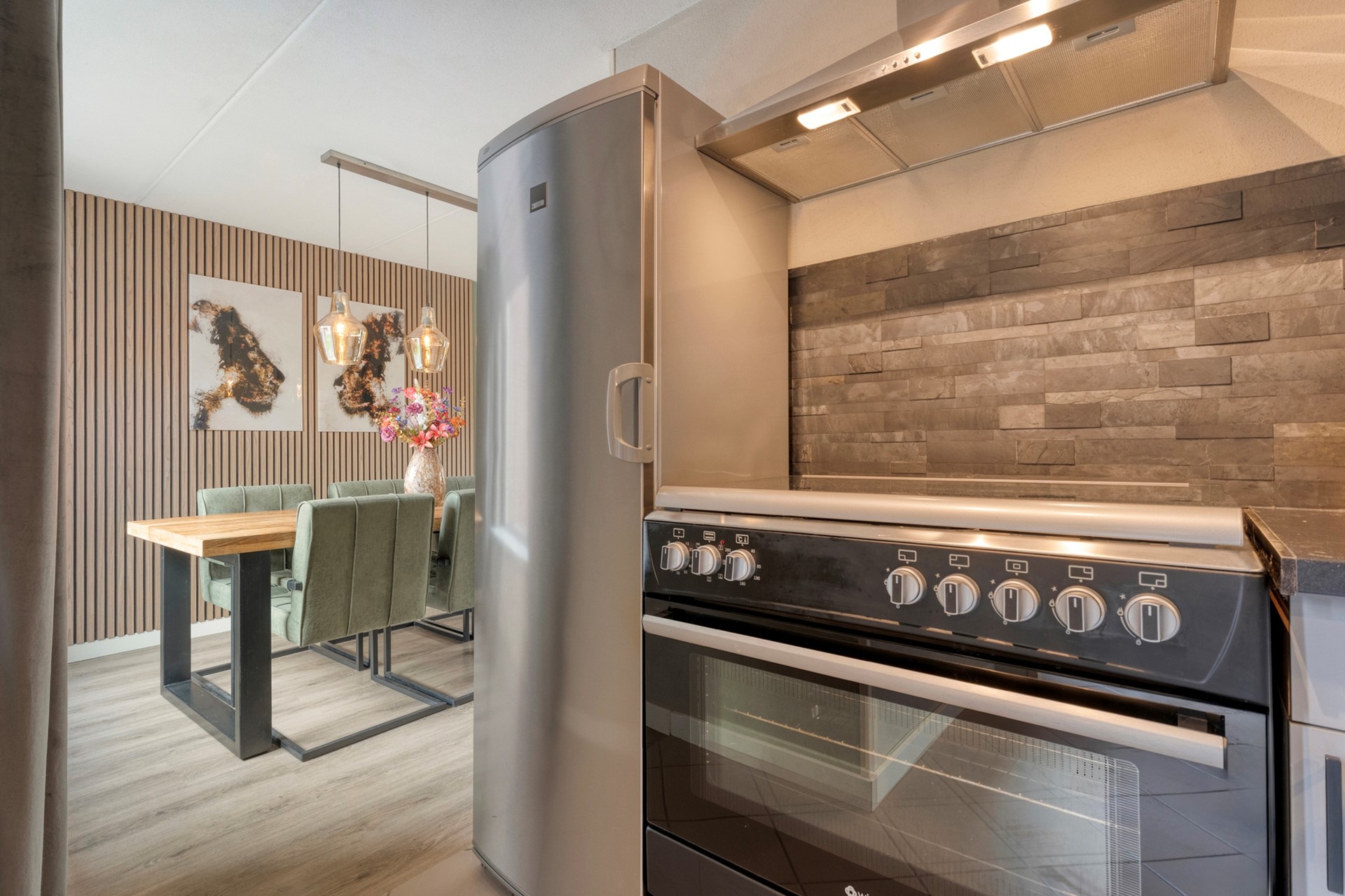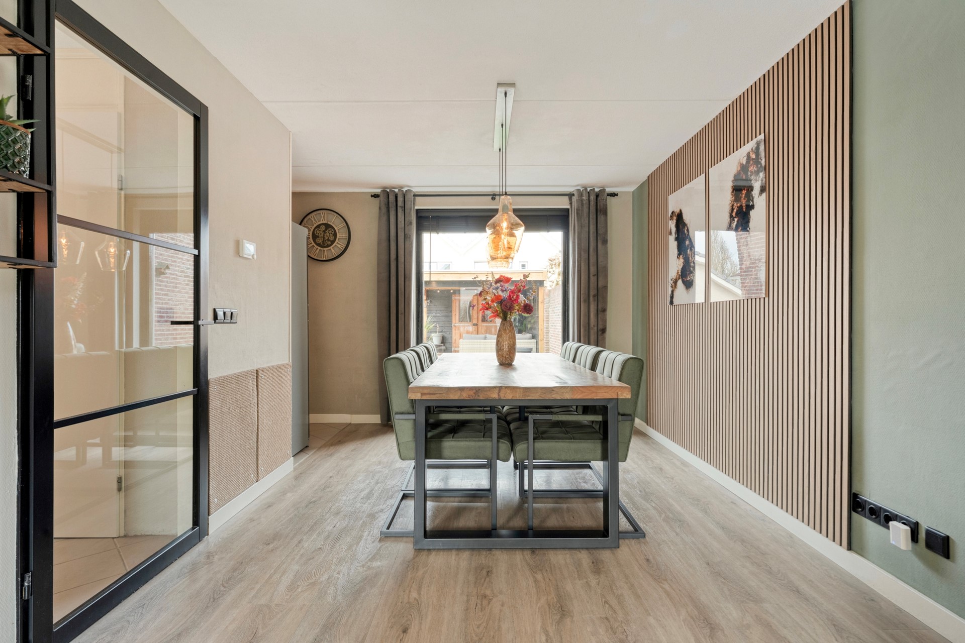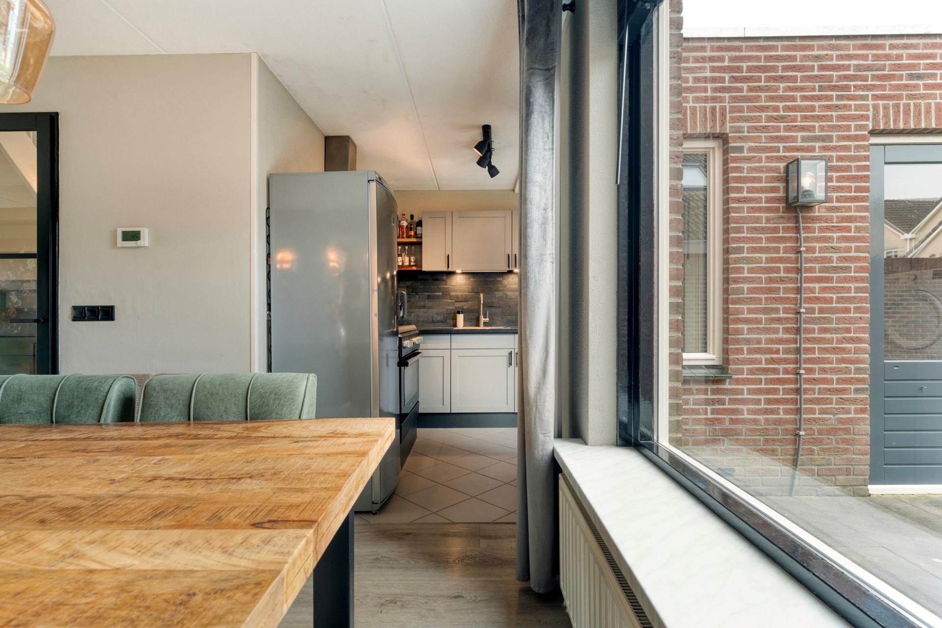 Aan de achterzijde bevindt zich het eetgedeelte met ruimte voor een grote eettafel, ideaal om uitgebreid te tafelen met vrienden of het gezin.