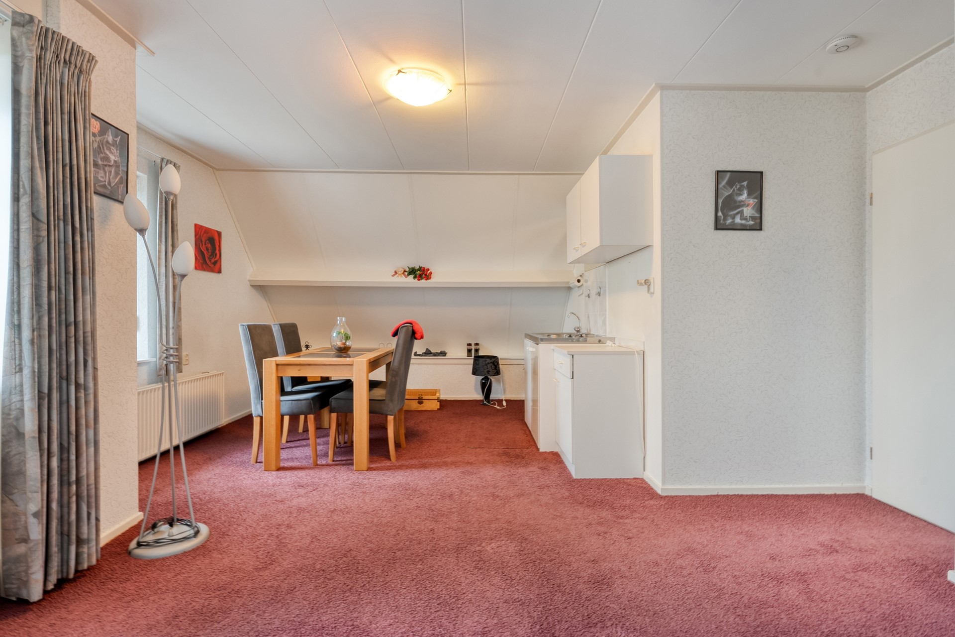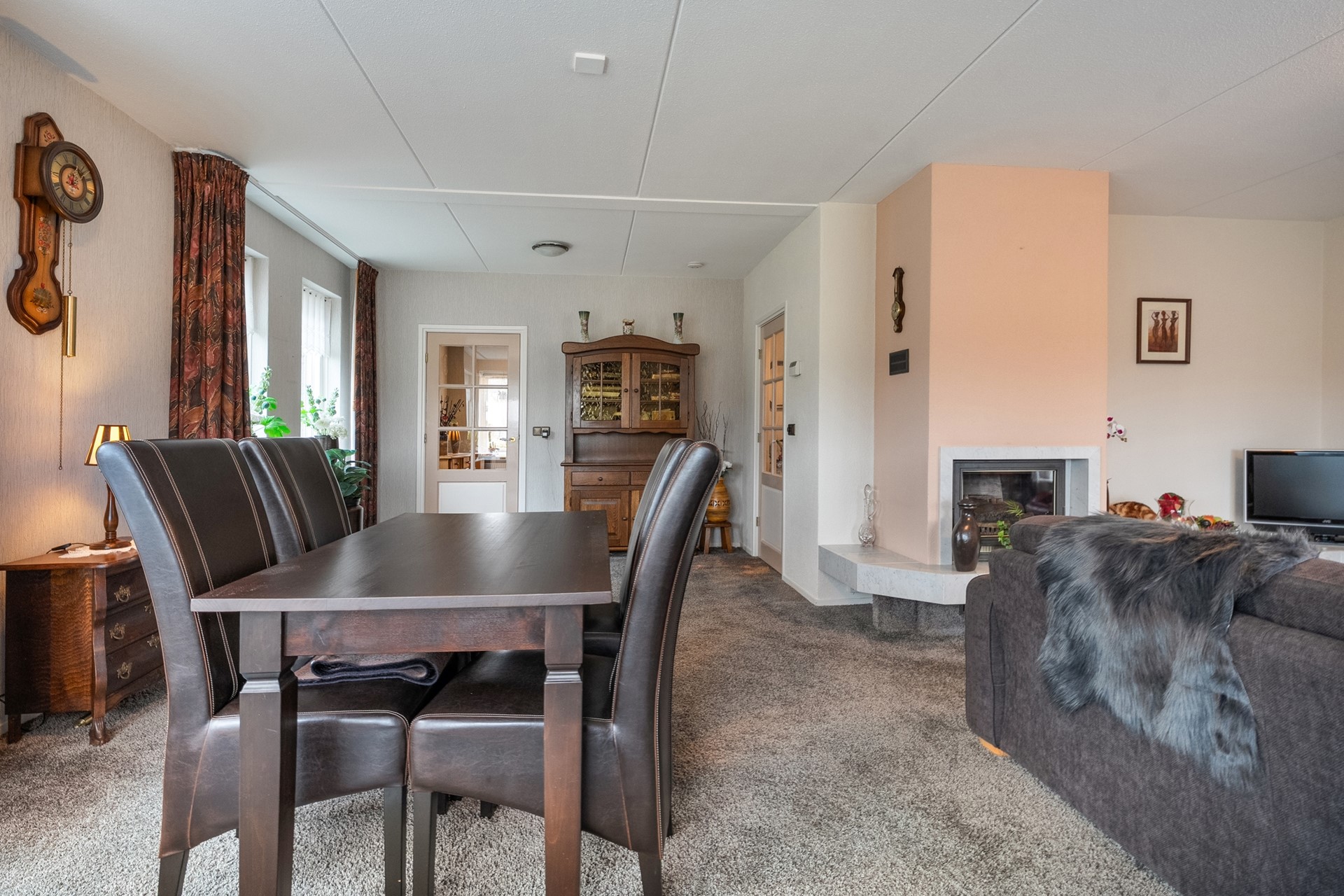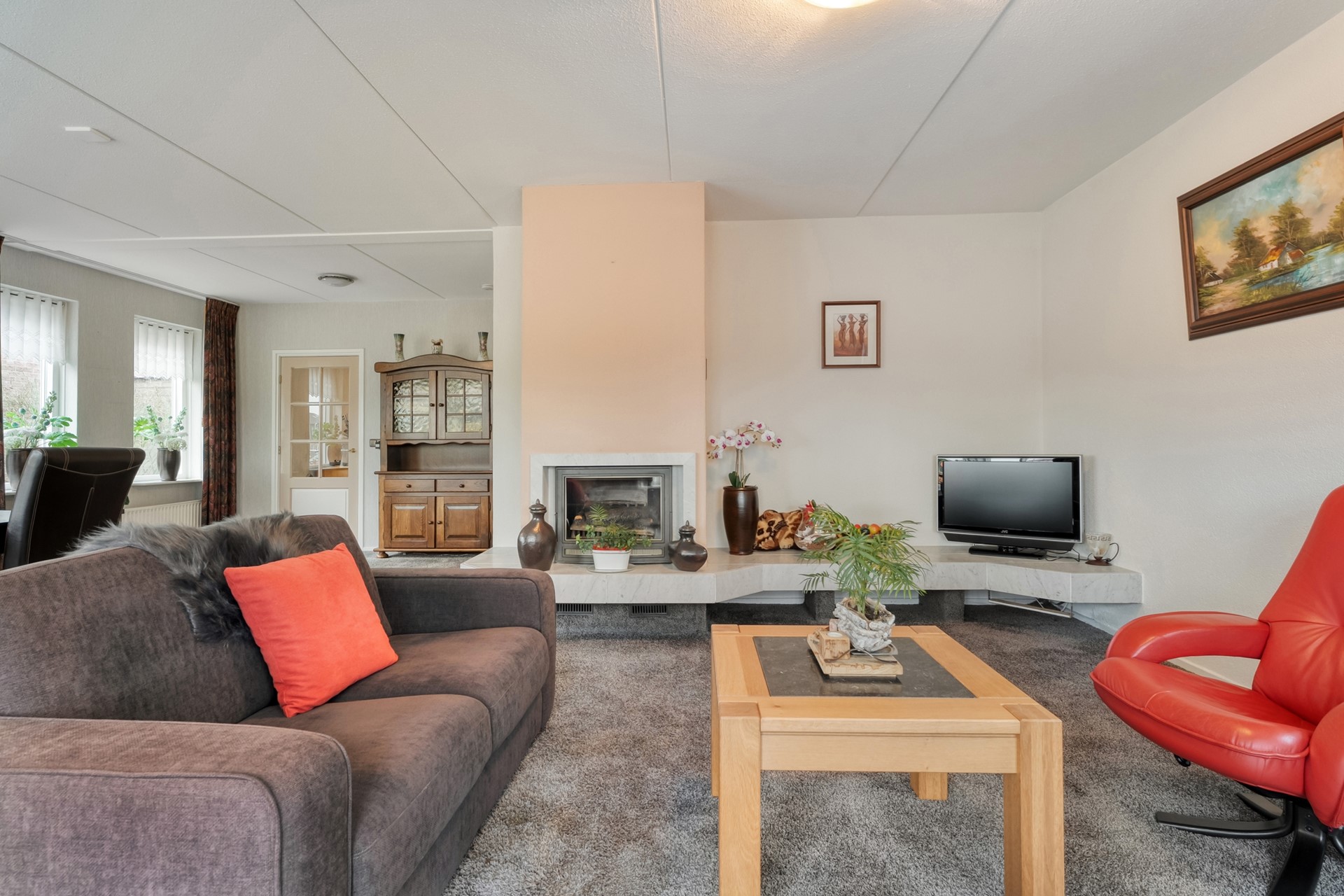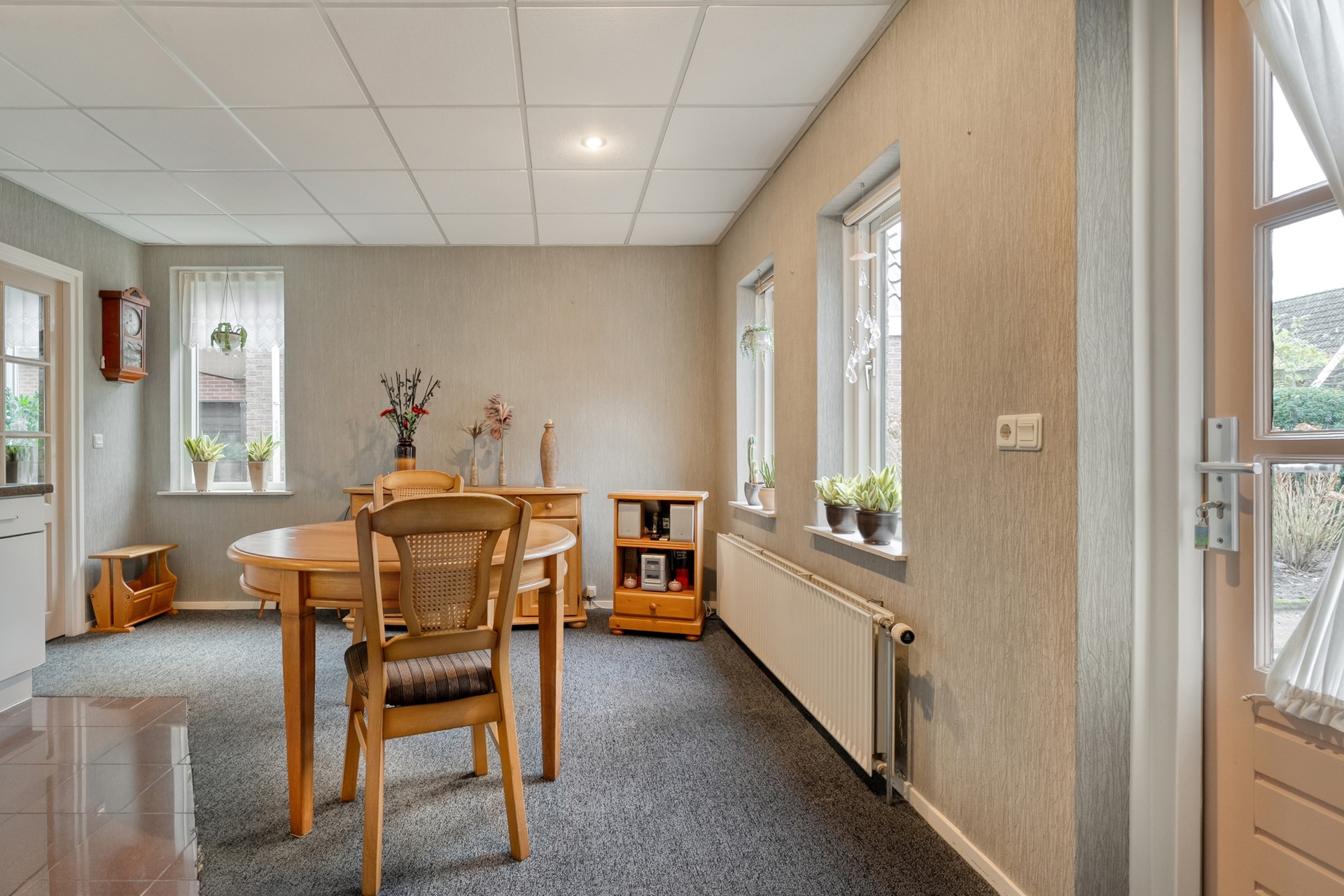 De woonkamer is ruim opgezet en prettig licht, mede dankzij de erker. De vloer is afgewerkt met tapijt en de gaskachel zorgt voor extra sfeer en comfort. Vanuit de woonkamer is er een deur naar de keuken.