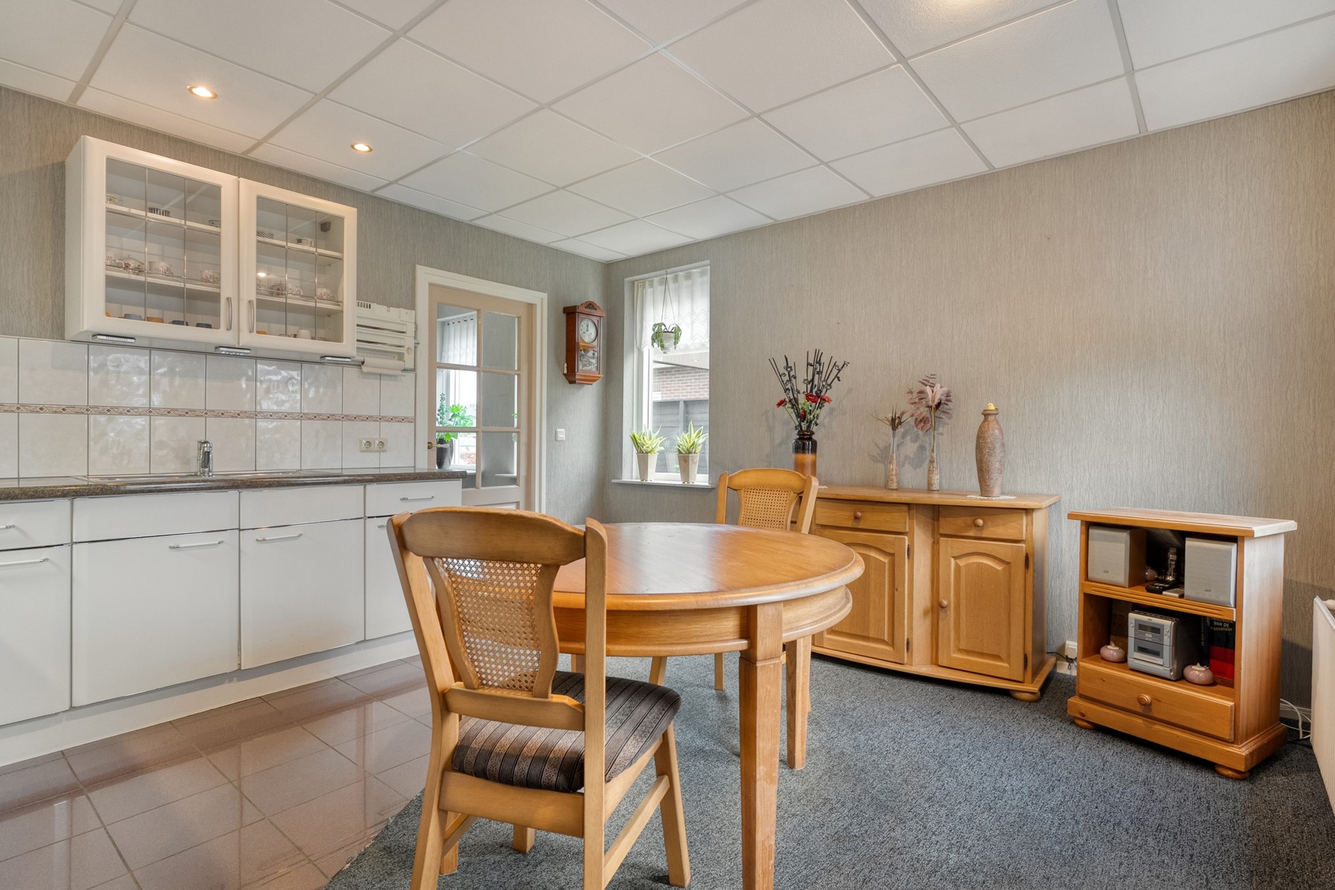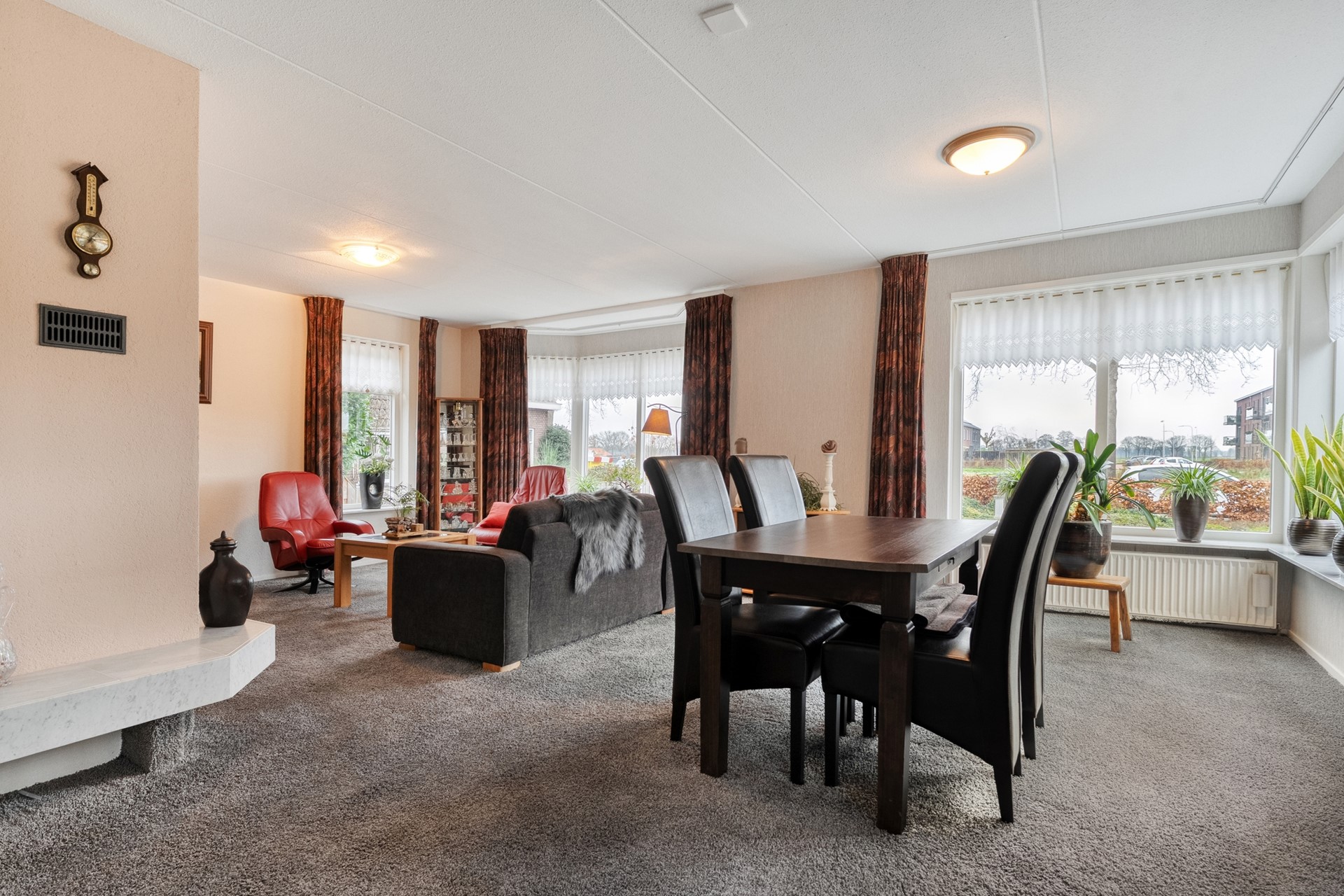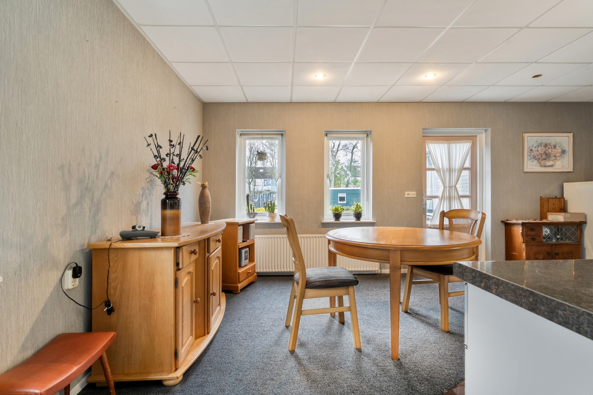 De woonkamer is ruim opgezet en prettig licht, mede dankzij de erker. De vloer is afgewerkt met tapijt en de gaskachel zorgt voor extra sfeer en comfort. Vanuit de woonkamer is er een deur naar de keuken.