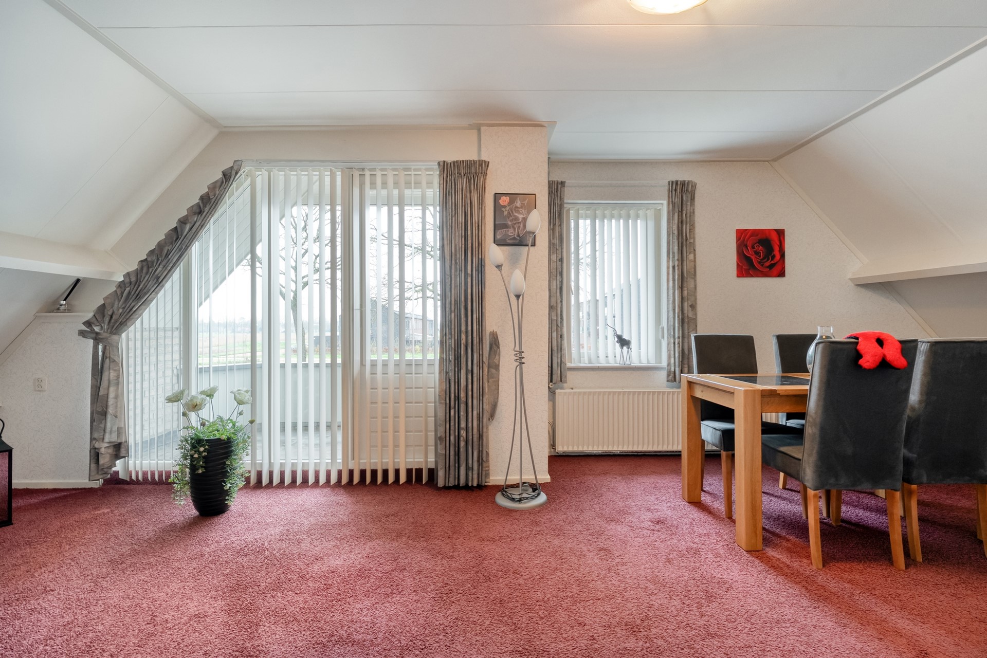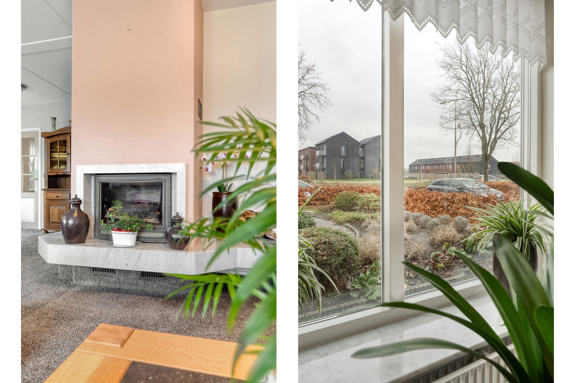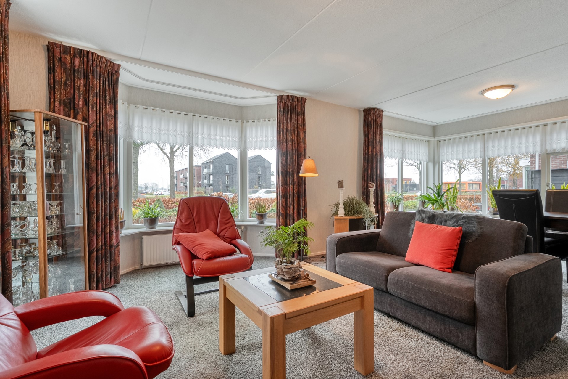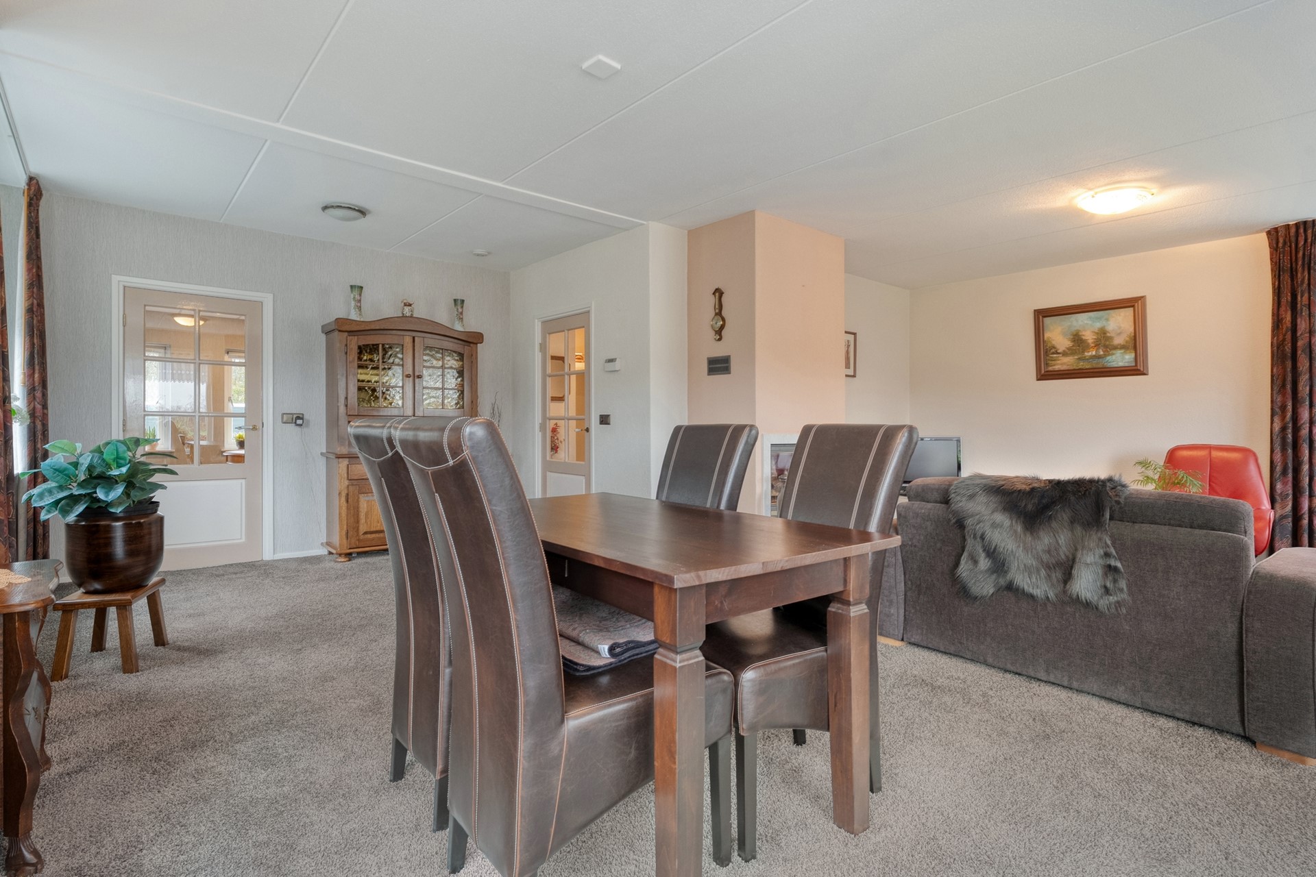 De woonkamer is ruim opgezet en prettig licht, mede dankzij de erker. De vloer is afgewerkt met tapijt en de gaskachel zorgt voor extra sfeer en comfort. Vanuit de woonkamer is er een deur naar de keuken.