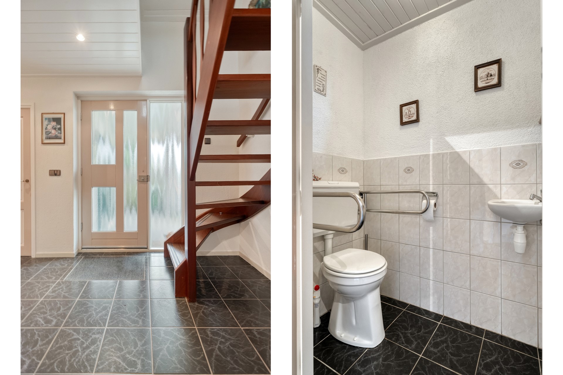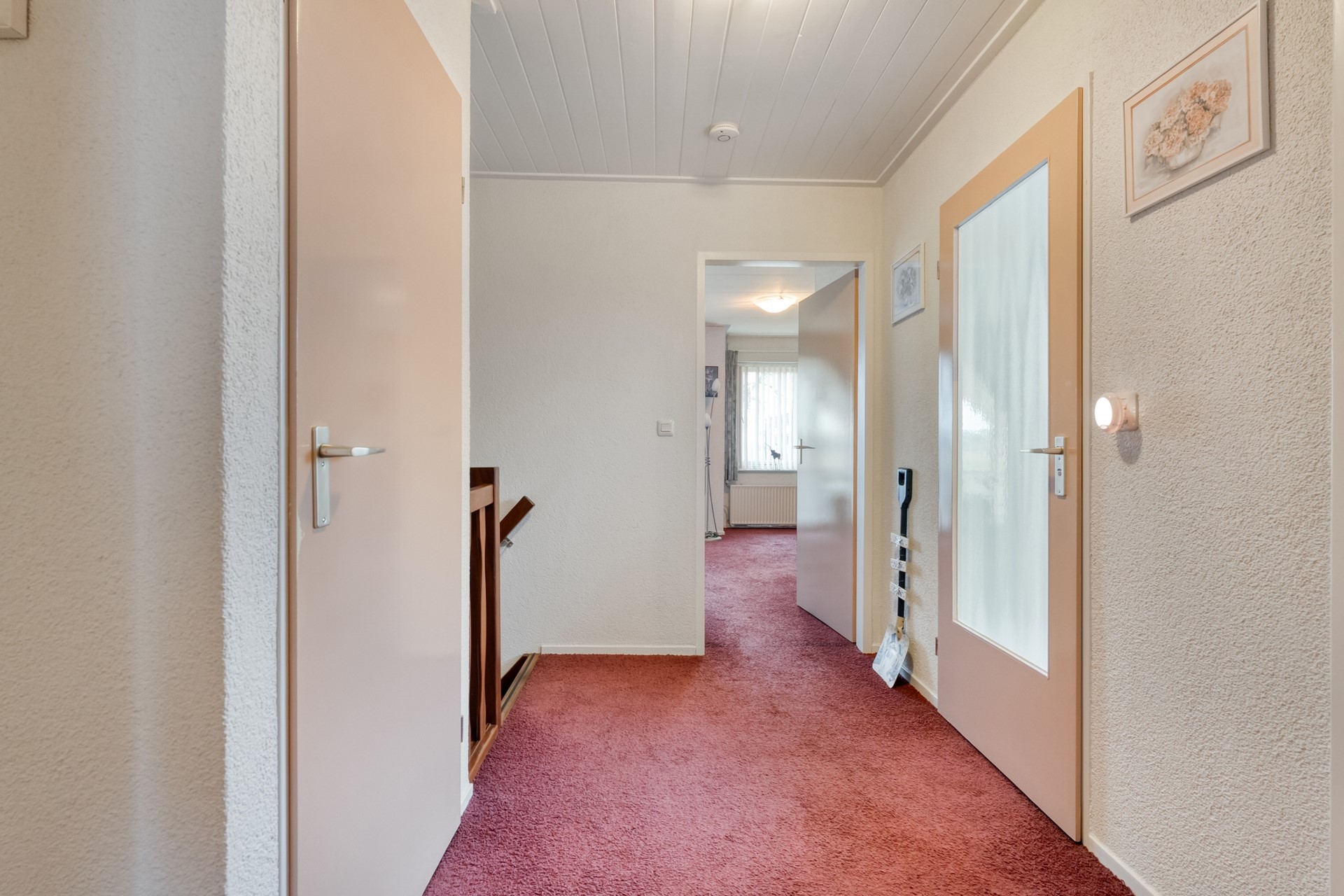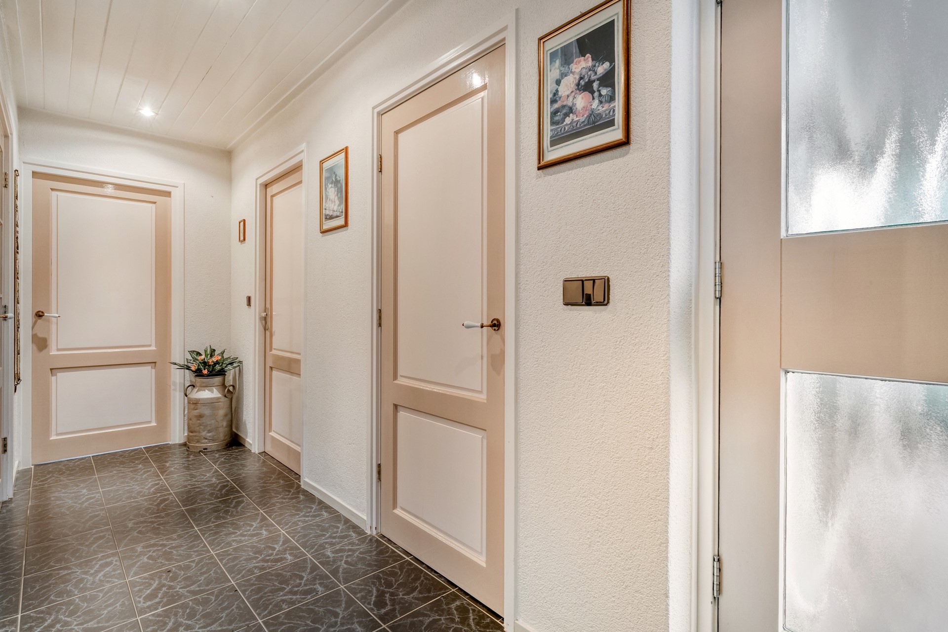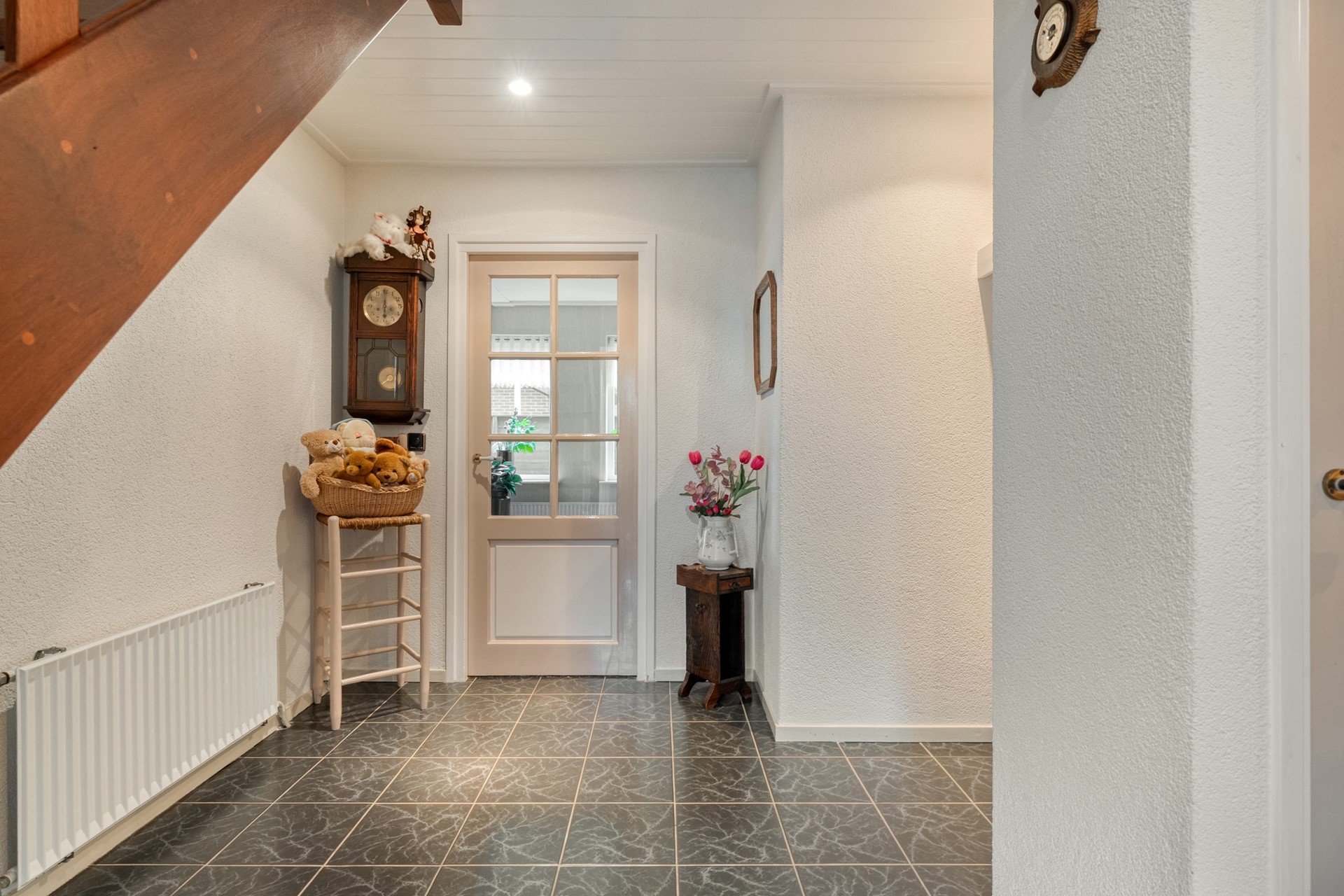 Via de voordeur kom je binnen in een ruime hal, het centrale vertrek van de woning. Vanuit hier heb je toegang tot alle vertrekken. In de hal bevinden zich het toilet met fonteint en de meterkast met glasvezelaansluiting.
