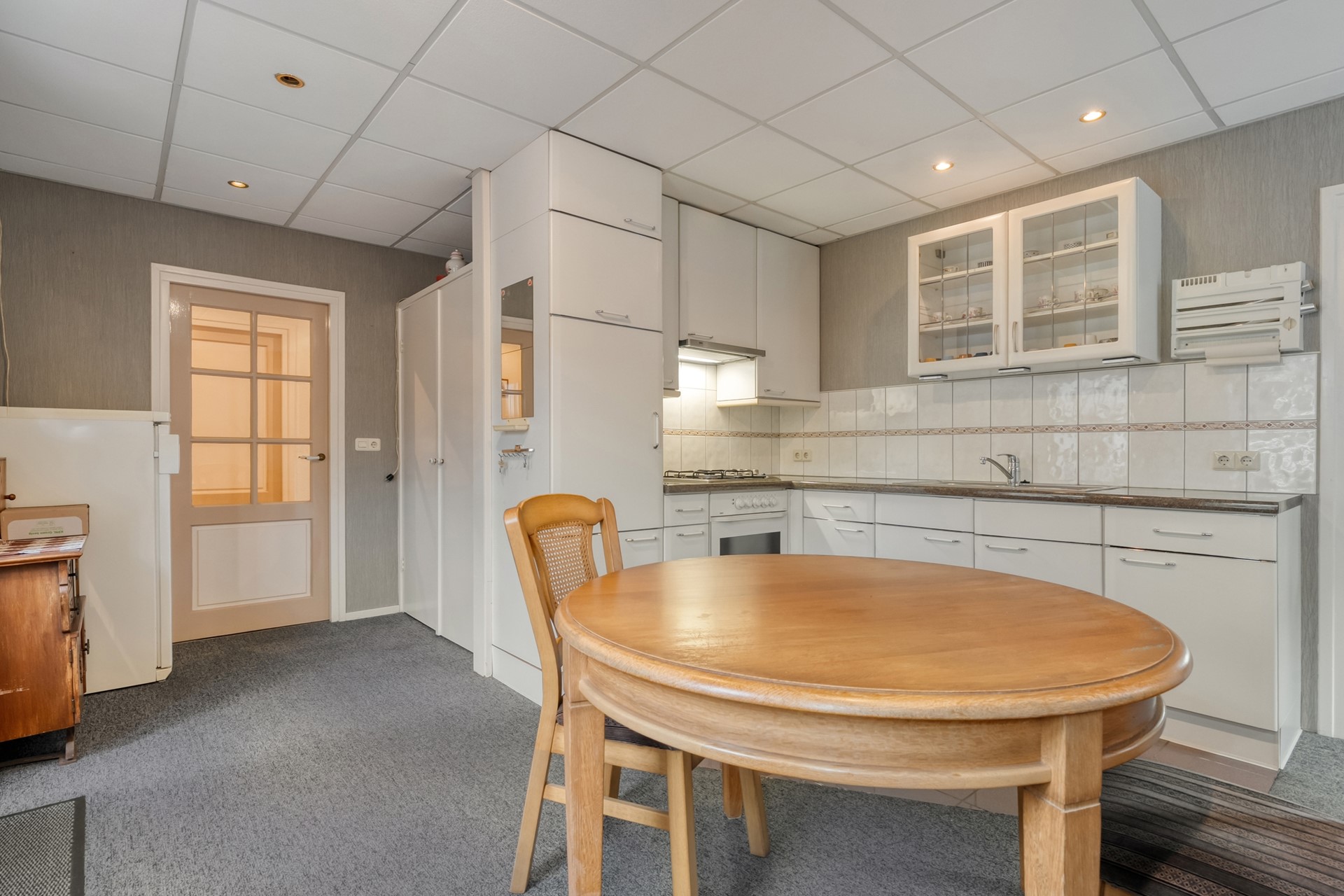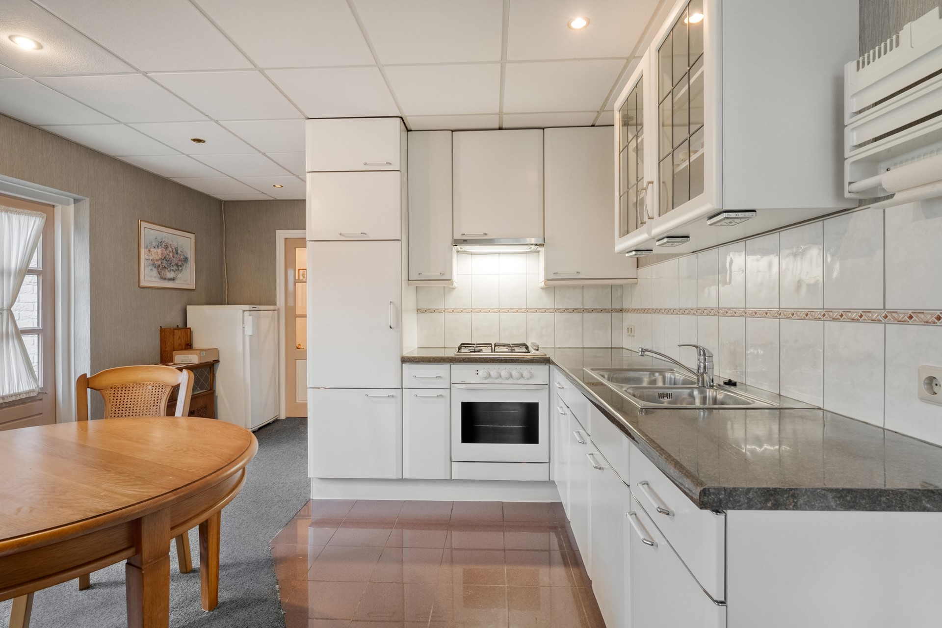 De keuken dateert uit 1991 en is uitgerust met een 4-pits gasfornuis, afzuigkap en koelkast. Vanuit de keuken heb je bovendien direct toegang tot de prachtige achtertuin via een buitendeur.
