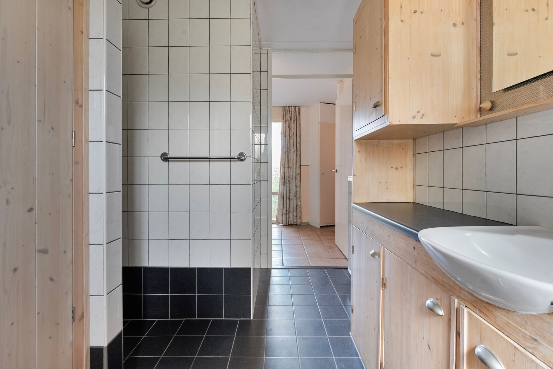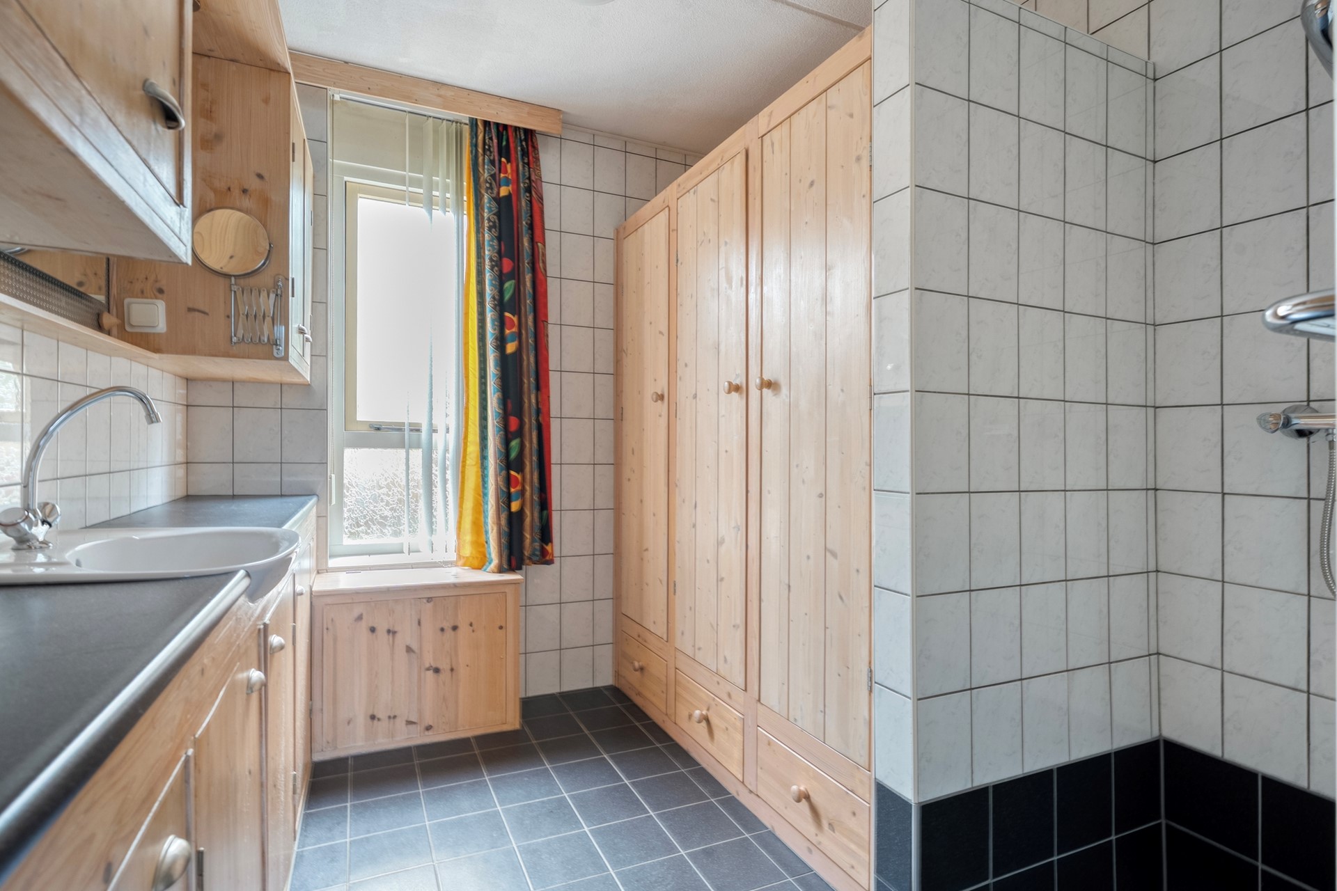 De slaapkamer en badkamer bevinden zich op de begane grond, ideaal voor wie gelijkvloers wil wonen. De badkamer (eveneens vernieuwd in 2015) is uitgevoerd met een inloopdouche, wastafelmeubel en vaste kastenwand.