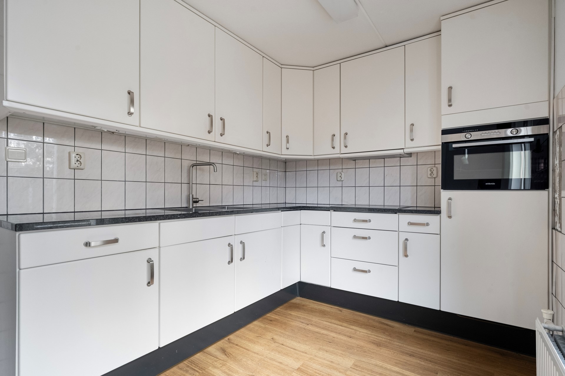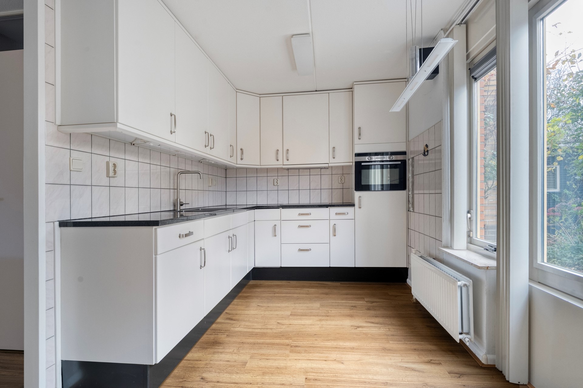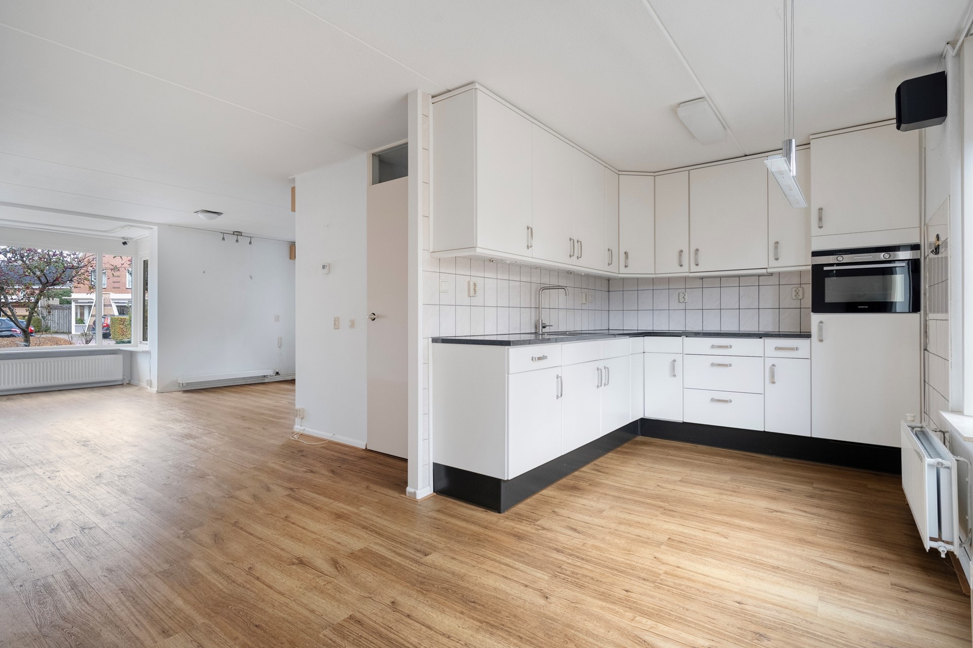 De woonkamer is licht en gezellig, met een prettig uitzicht op de tuin. De open keuken (vernieuwd in 2015) sluit mooi aan bij de leefruimte en is voorzien van inbouwapparatuur zoals een inductiekookplaat, koelkast en combi-oven. Een heerlijke plek om samen te koken en te tafelen.