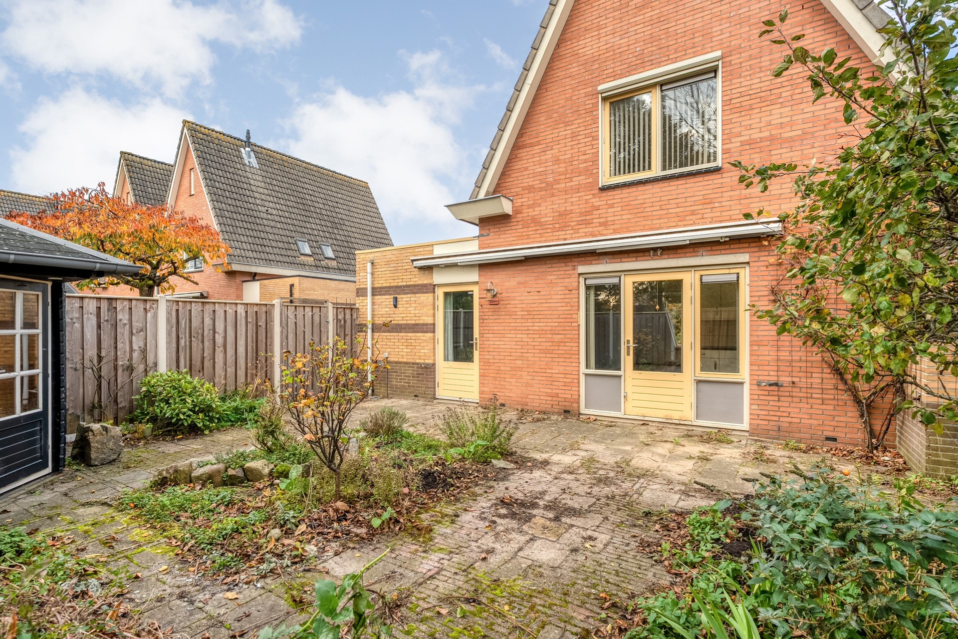 Achter het huis ligt een heerlijk zonnige tuin op het zuiden, waar je volop privacy geniet. De tuin is verzorgd aangelegd en biedt een achterom aan de zijkant, zodat je ook gemakkelijk met de fiets of tuingereedschap achterom kunt. Verder is er een schuur voor extra bergruimte, een elektrisch uitvalscherm aan de achterzijde en rollscreens rondom de meeste ramen, perfect om in elk seizoen comfortabel te wonen.
