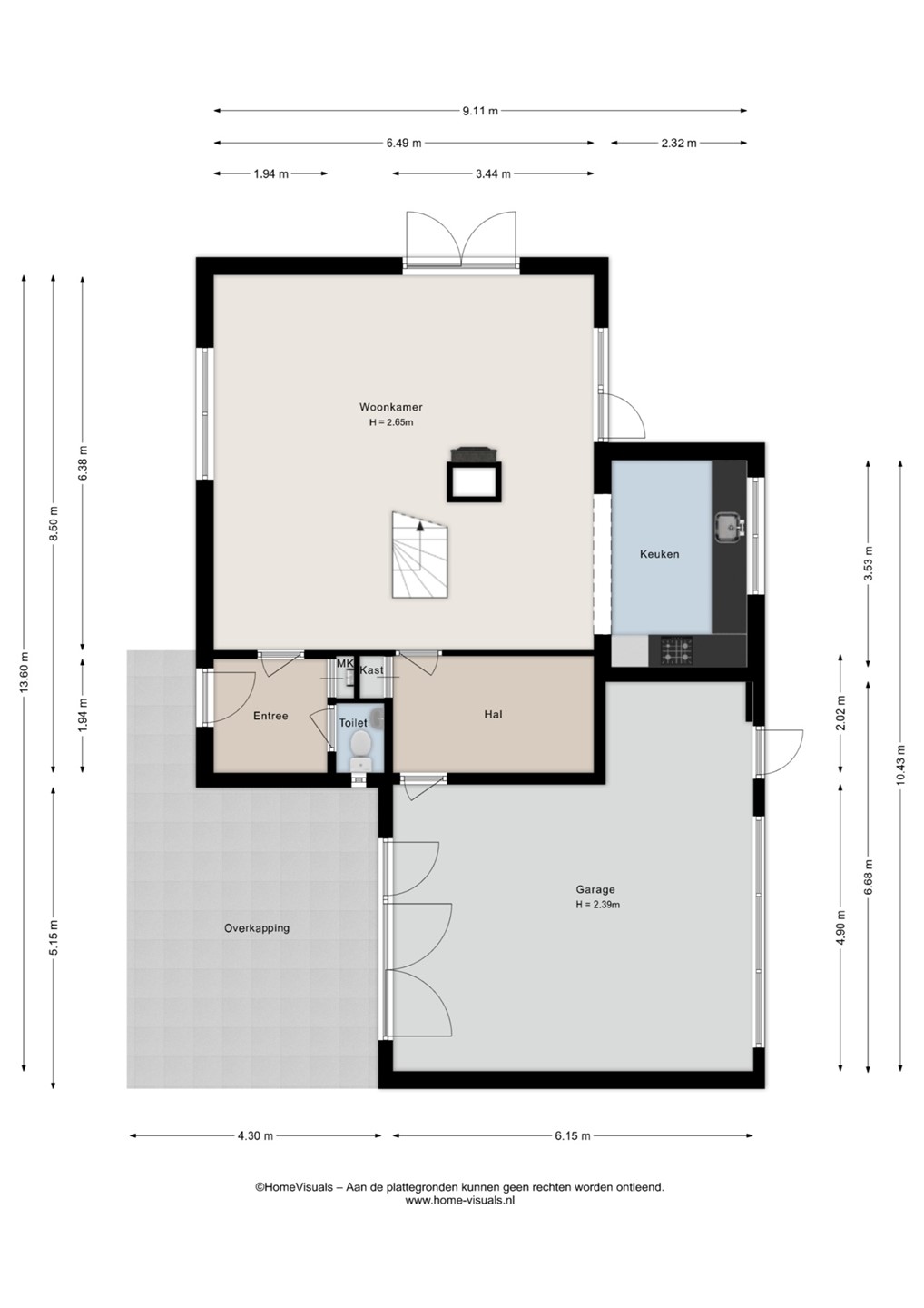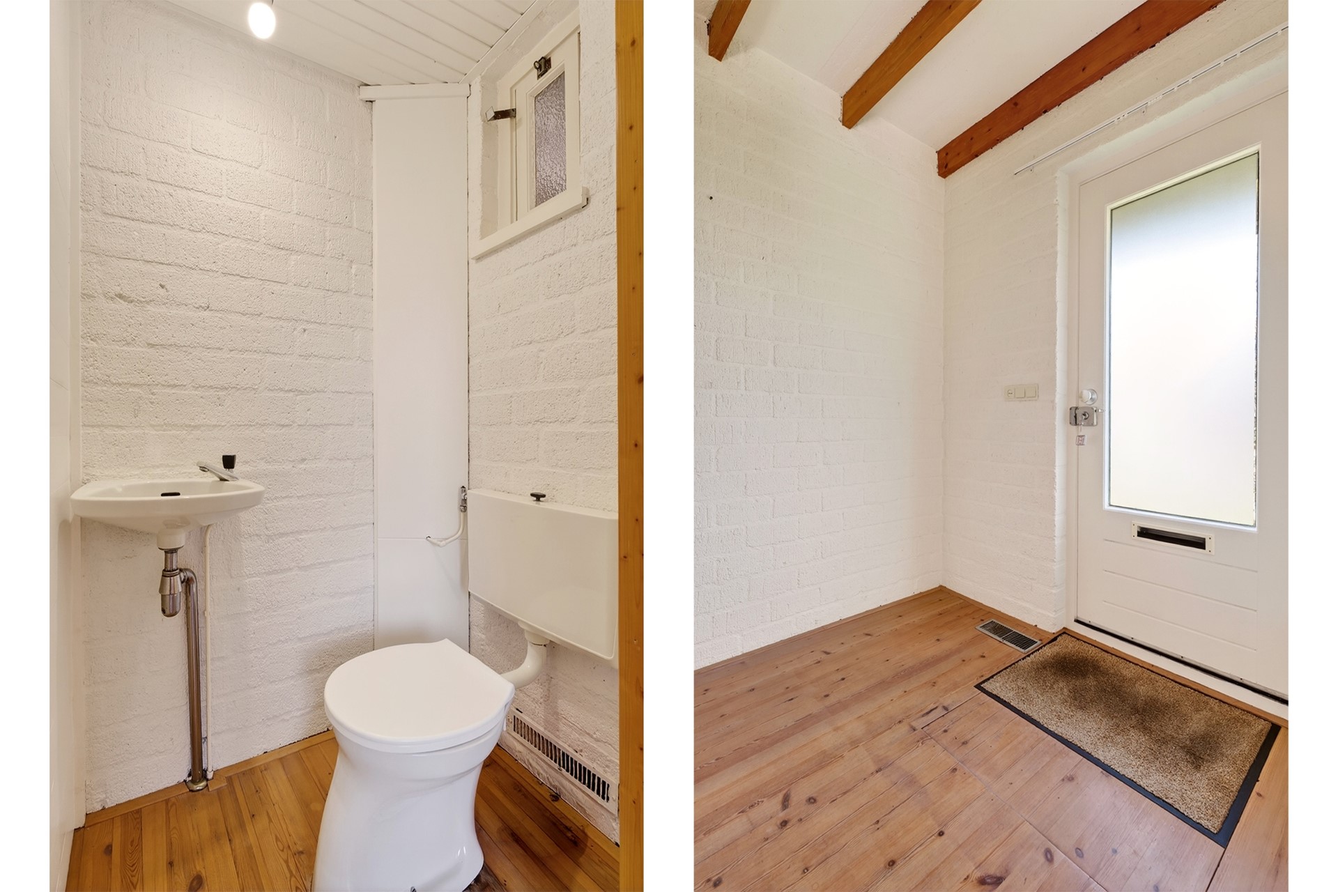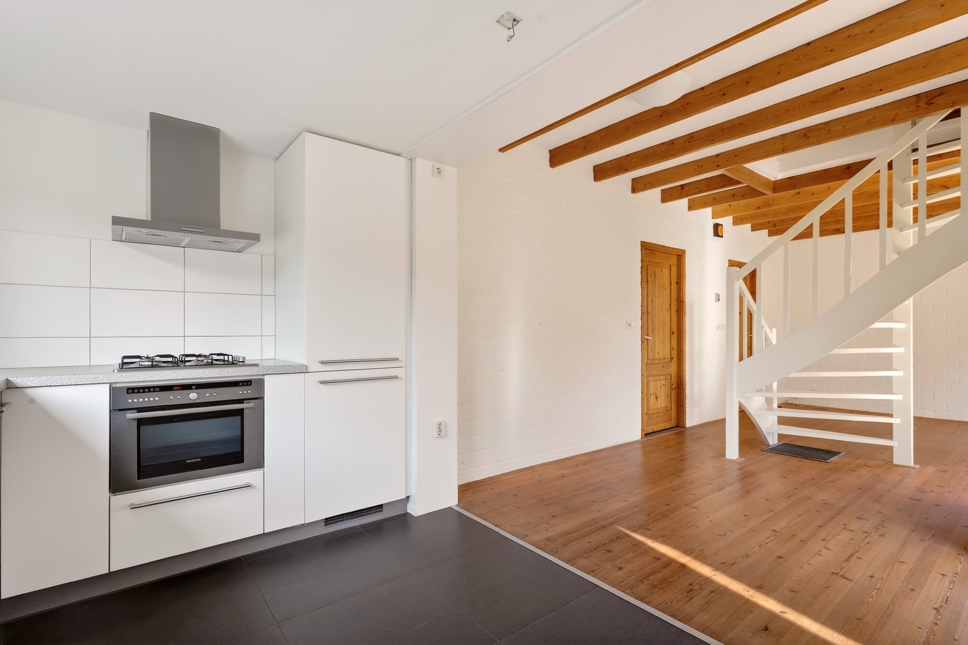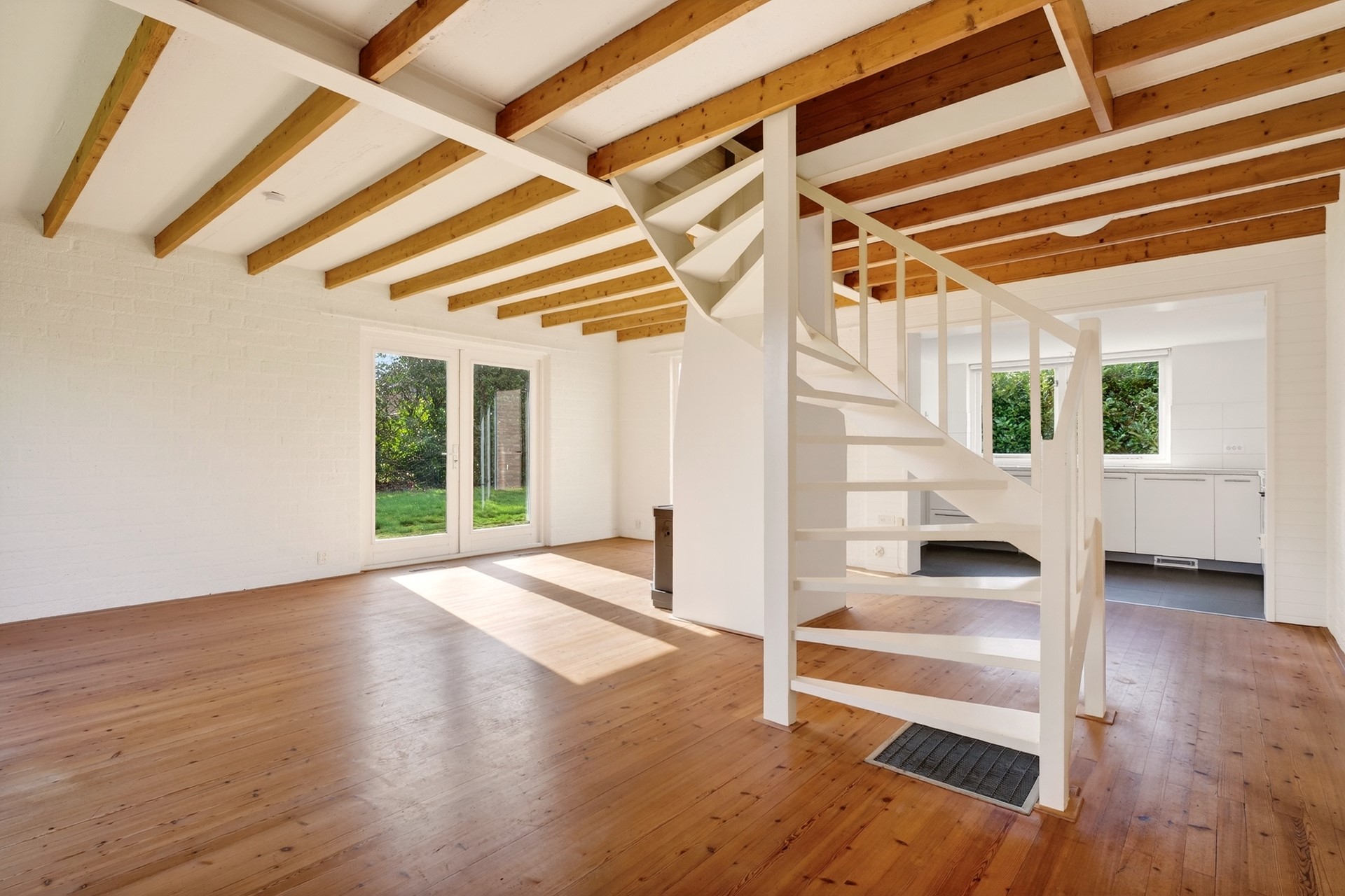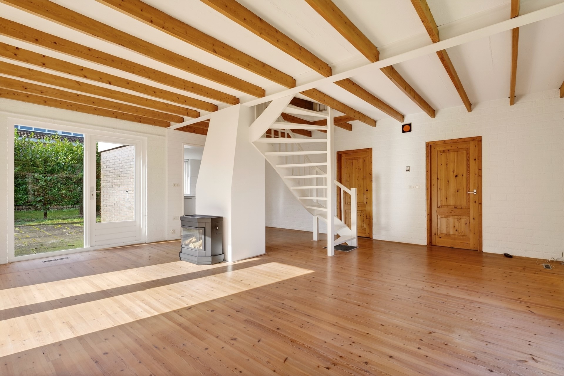 Via de voordeur kom je binnen in de hal, waar zich de meterkast en het toilet bevinden. Vanuit hier stap je de ruime woonkamer in. Wat direct opvalt zijn de grote raampartijen die doorlopen tot aan de grond. Dit zorgt voor veel lichtinval en geeft de ruimte een open en eigentijdse uitstraling. In de woonkamer bevindt zich een gaskachel voor extra warmte en sfeer. De woning is gebouwd met een houten balkenlaag en een plenumruimte, destijds veel toegepast in combinatie met hete luchtverwarming. Dit type bouw was kenmerkend voor de jaren zeventig. De keuken is in 2011 geplaatst en in die periode tevens uitgebouwd, waardoor er extra leefruimte is ontstaan. De keuken is voorzien van een combi-oven, vaatwasser, 4-pits gaskookplaat en een koelkast met vriesvak. Aansluitend bevindt zich de bijkeuken, waar de hete luchtverwarming uit 1975 staat opgesteld, evenals de boiler voor de opslag van warm water.