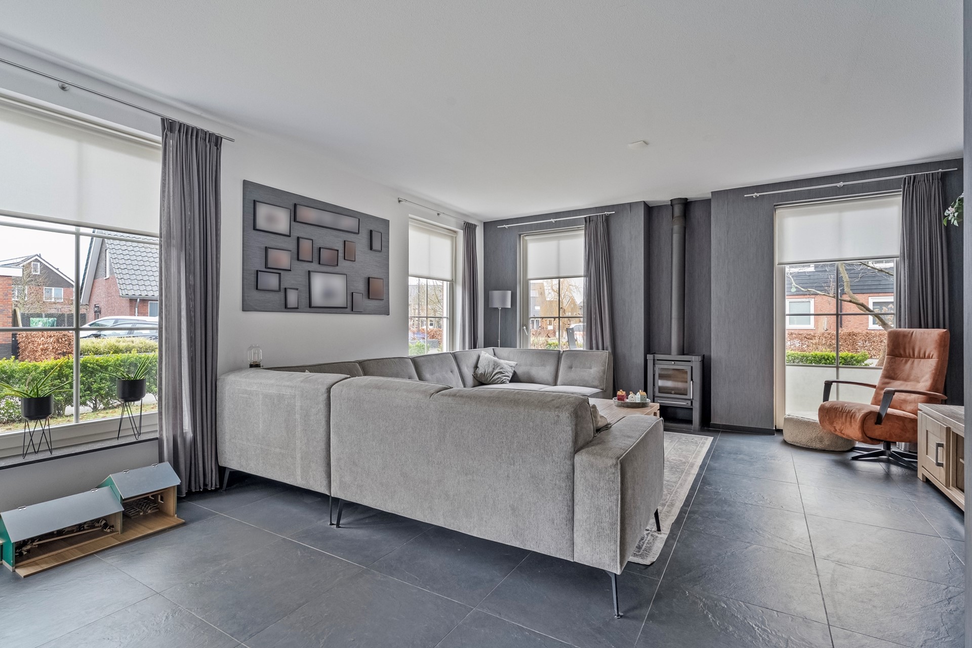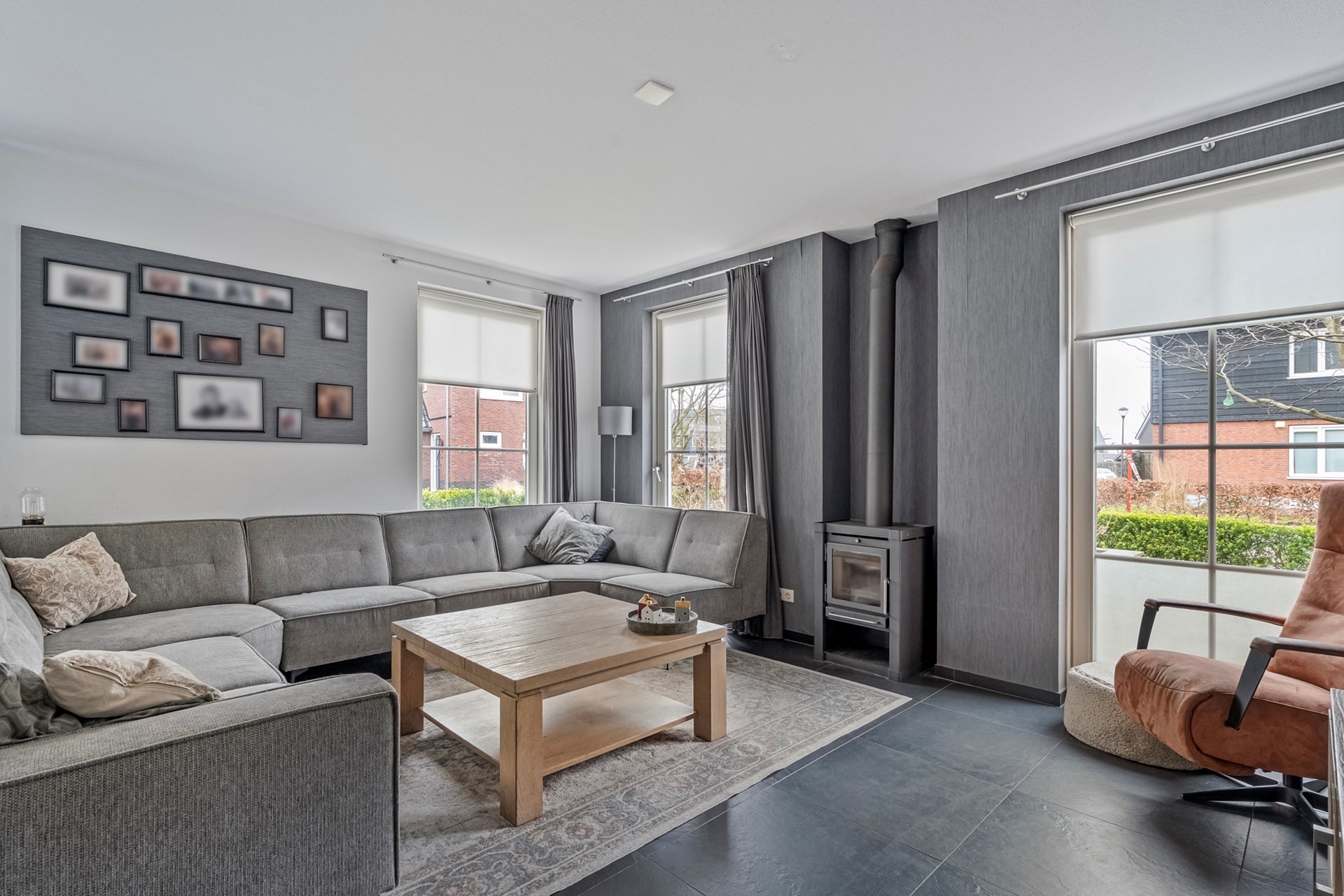 Vanuit de hal loop je de royale woonkamer in of richting de eetkamer en keuken. De woonkamer is voorzien van plavuizen en valt direct op door de vele raampartijen met roedeverdeling, wat zorgt voor een stijlvolle en karaktervolle uitstraling. De houtkachel maakt het geheel compleet en zorgt in de wintermaanden voor extra sfeer en warmte.