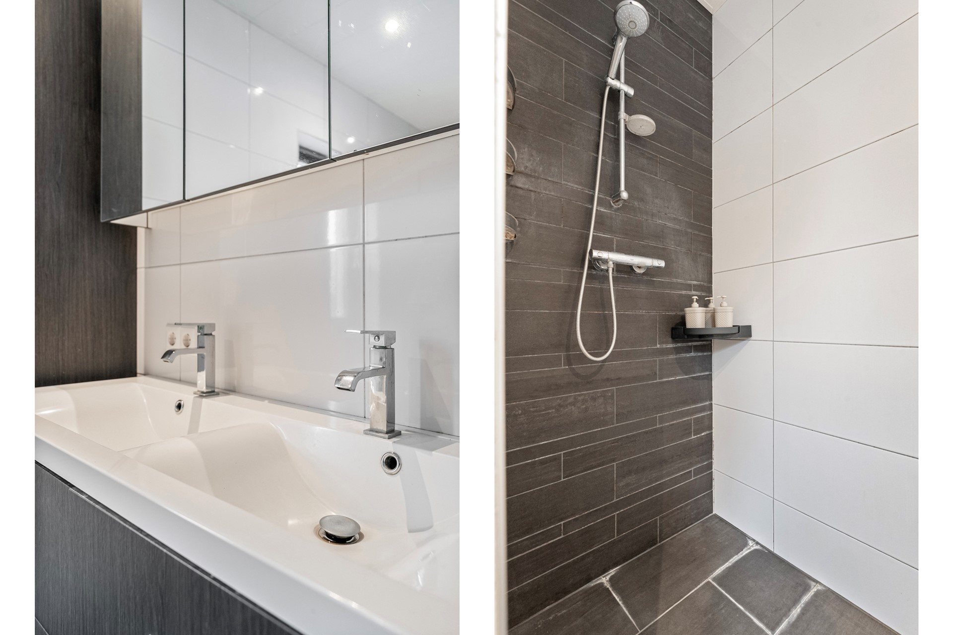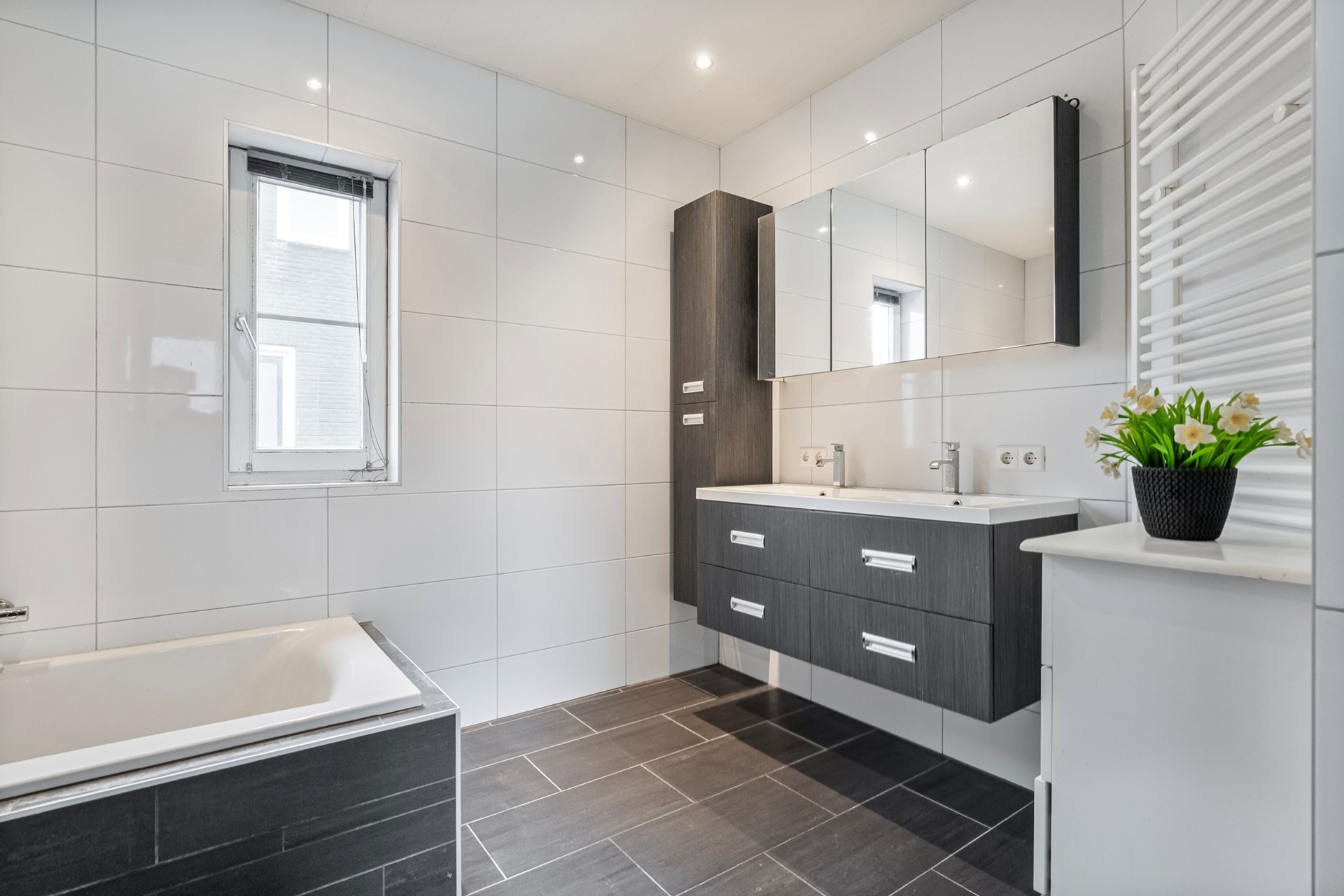 De badkamer is compleet uitgevoerd met een dubbele wastafel, inloopdouche en natuurlijk een ligbad. Heerlijk ontspannen na een lange dag. De vlizotrap is dichtgemaakt, maar nog wel aanwezig. Via een vaste trap in één van de slaapkamers bereik je de tweede verdieping.