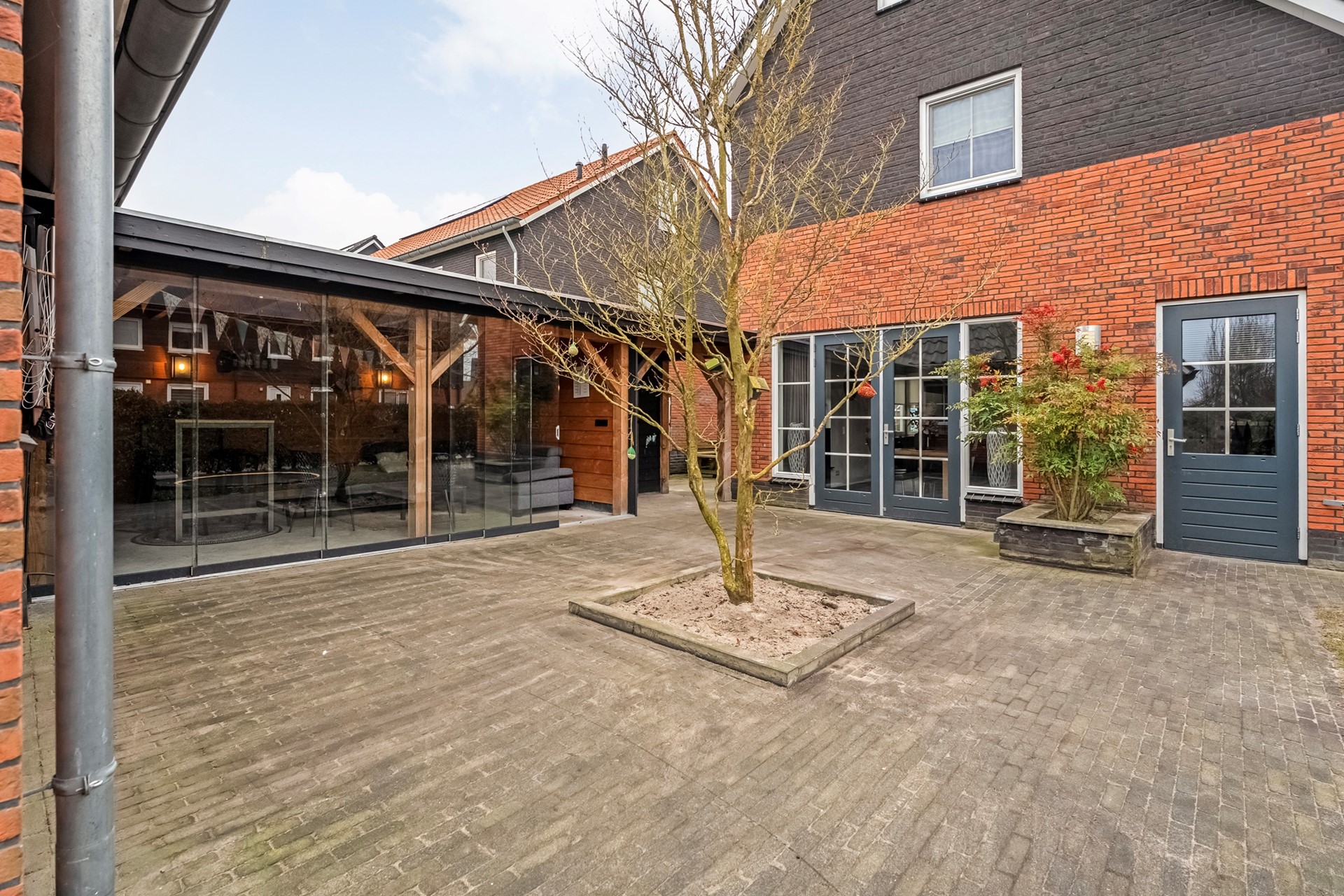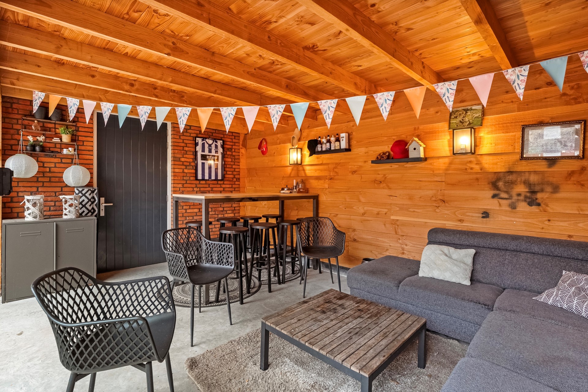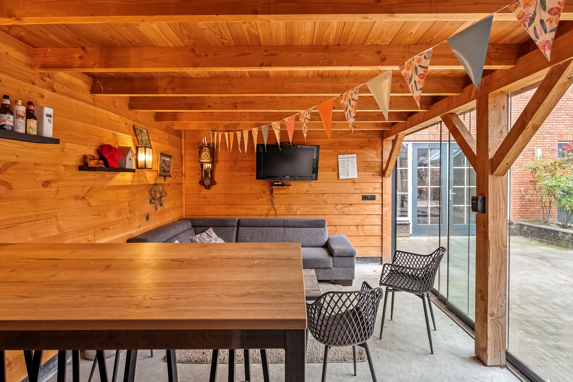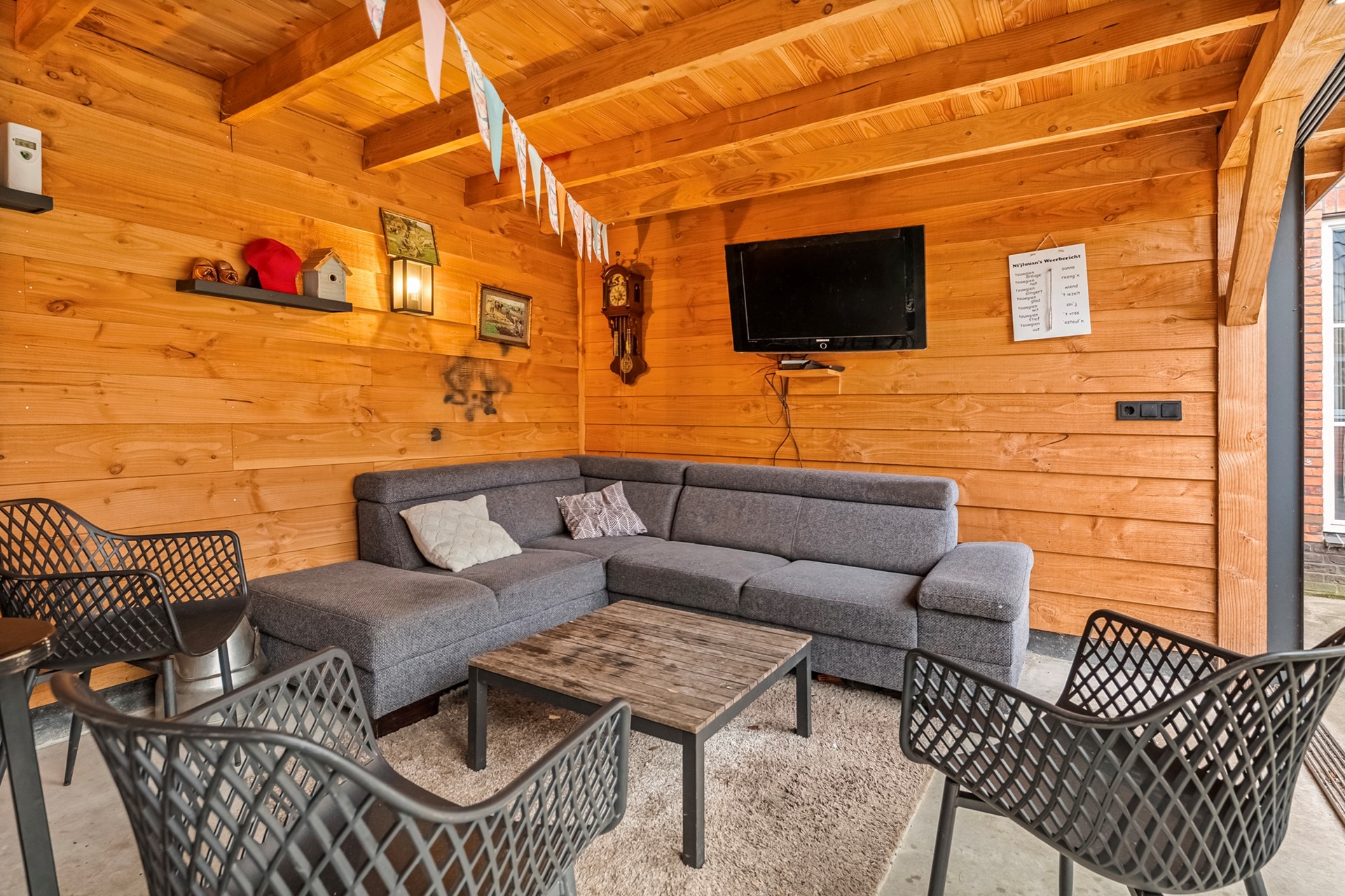 Buitenleven wordt hier ook naar een hoger niveau getild. De prachtige overkapping met glazen schuiframen zorgt ervoor dat je bijna het hele jaar door kunt genieten van het buiten zijn. Met de aangrenzende schuur heb je bovendien praktische bergruimte binnen handbereik.