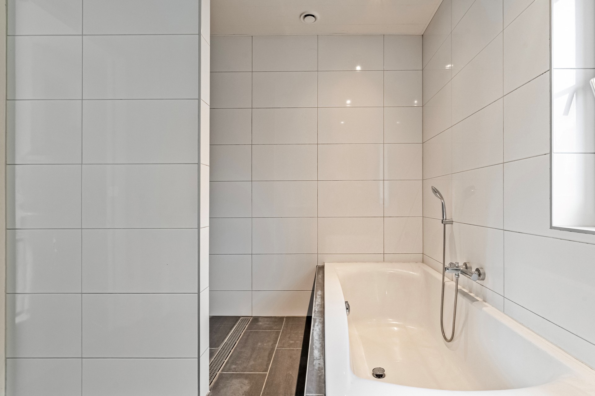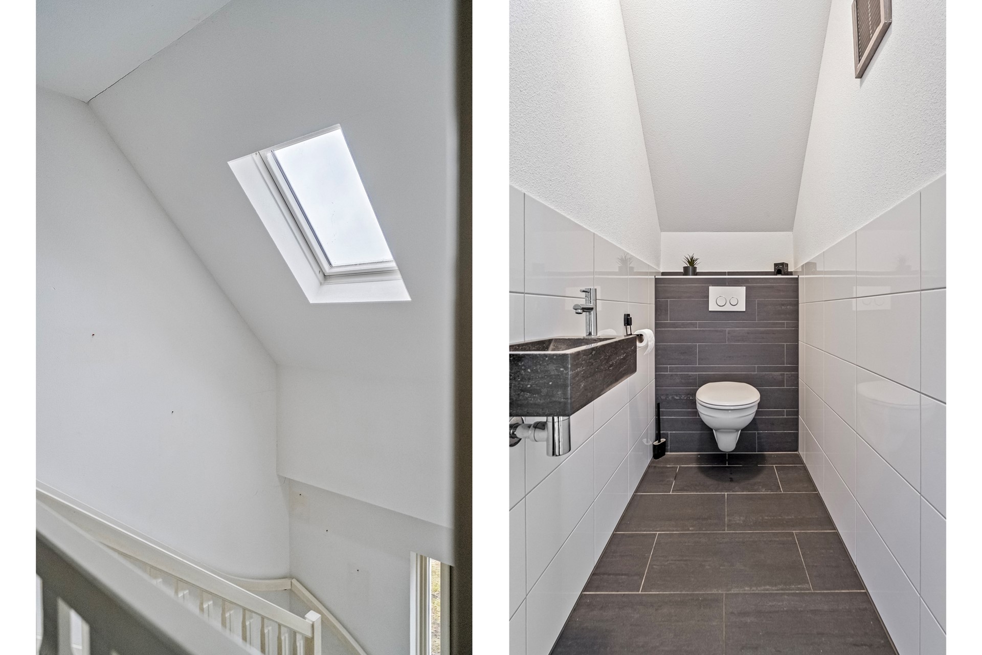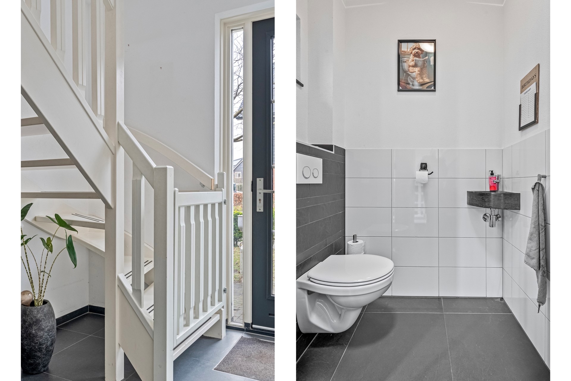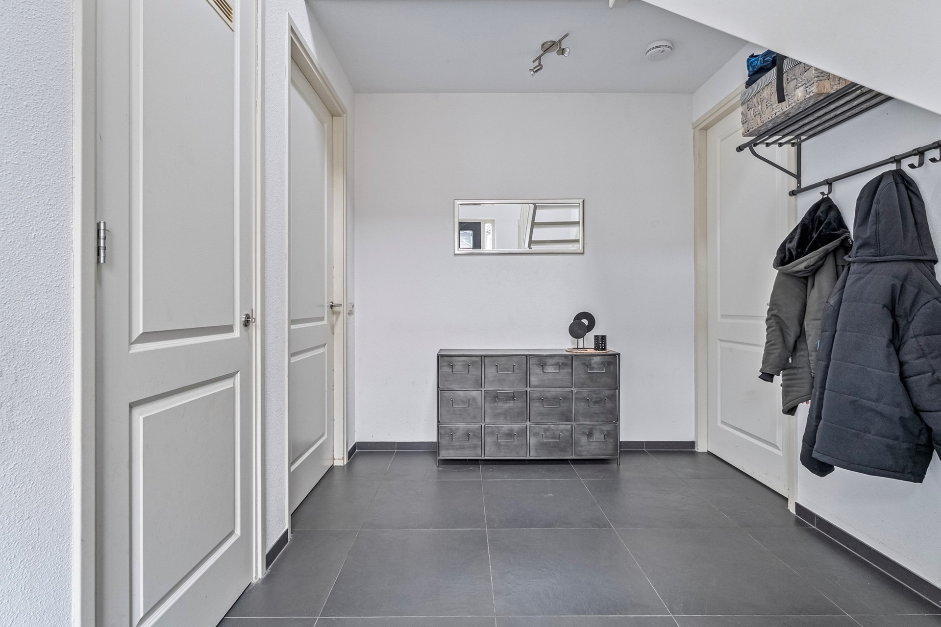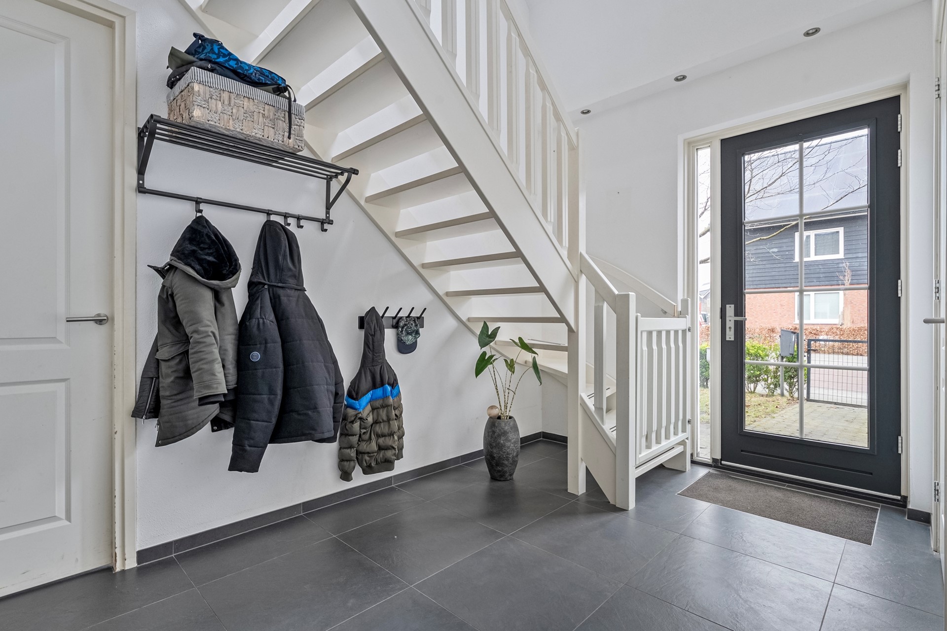 Via de voordeur kom je binnen in de ruime entree met voldoende plek voor een garderobe. Hier bevinden zich de trapopgang naar de eerste verdieping, de meterkast en het moderne toilet met hangend closet en fonteintje.