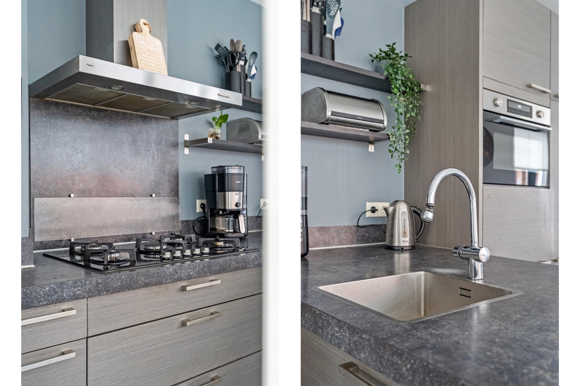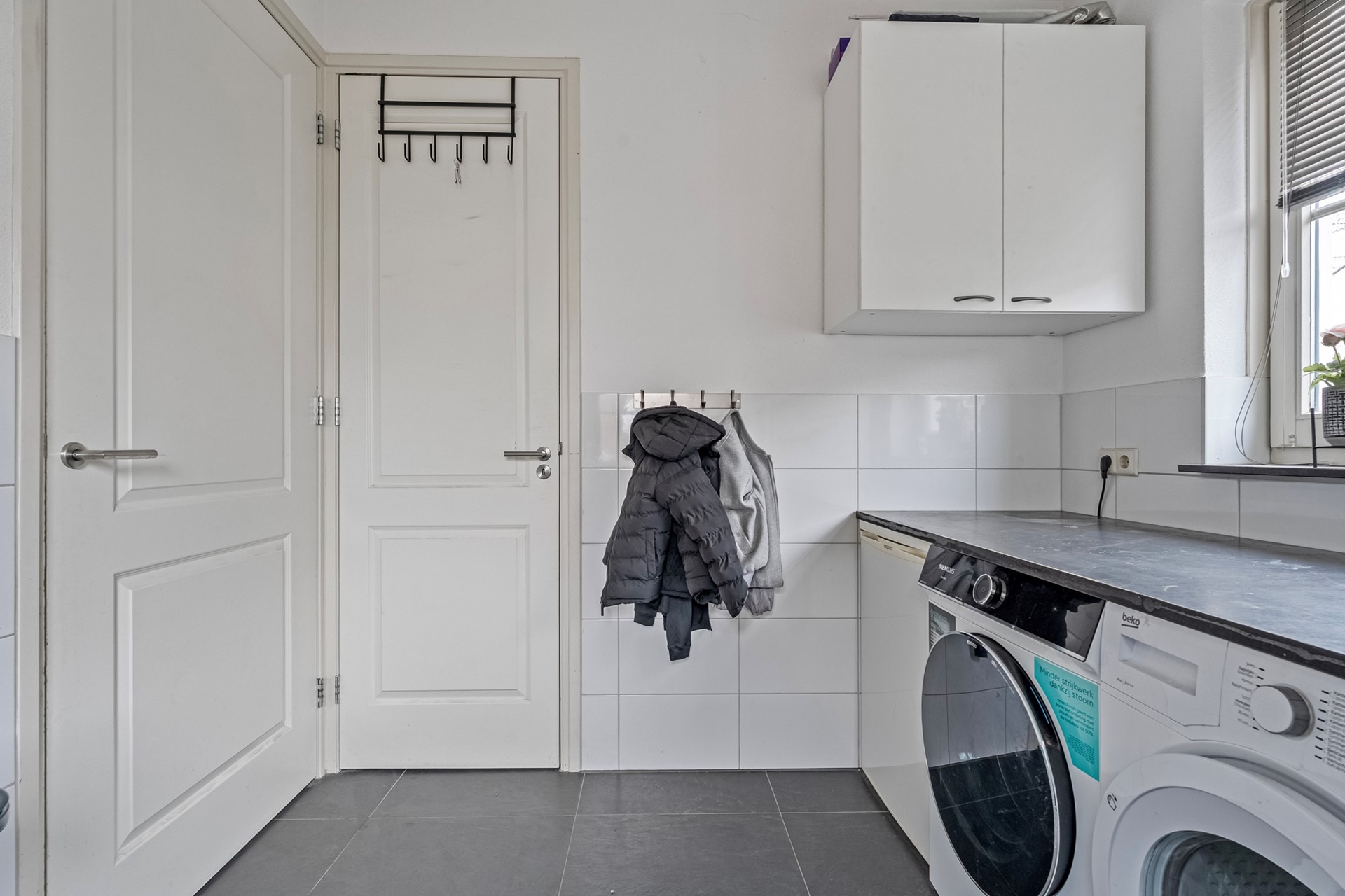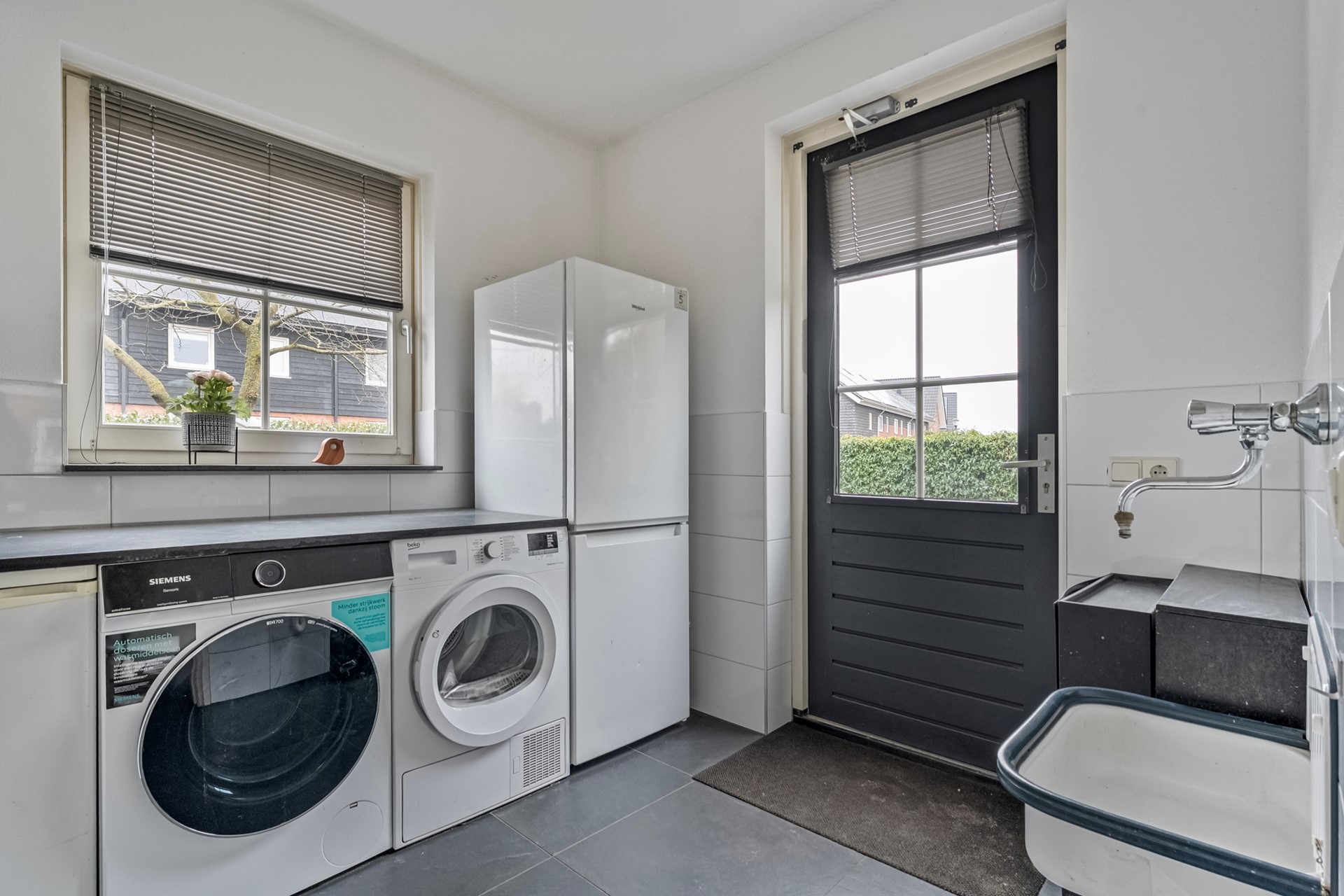 Vanuit de eetkamer bereik je de praktische bijkeuken met was- en droogopstelling en een vaste kast.