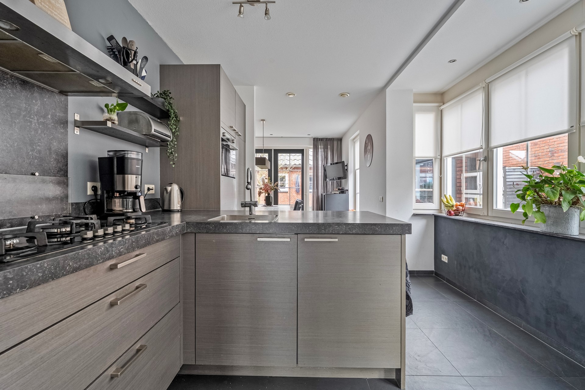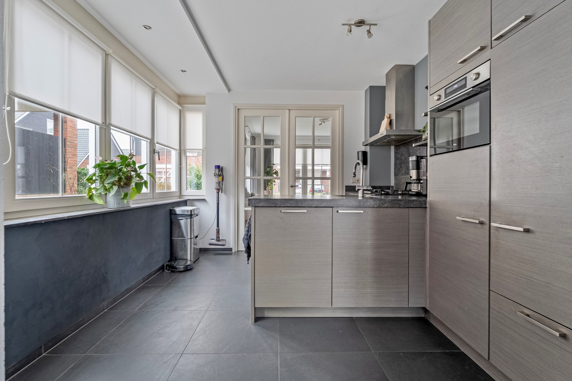 De keuken beschikt over een spoeleiland en diverse inbouwapparatuur, waaronder een 5-pits gaskookplaat met afzuiging, een combi-oven van circa 2 jaar oud en een vaatwasser van circa 1 jaar oud. De keuken staat in open verbinding met de eetkamer, waar openslaande deuren zorgen voor een prachtige overgang naar de tuin.