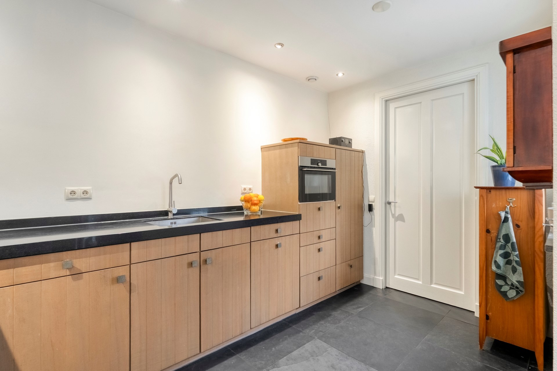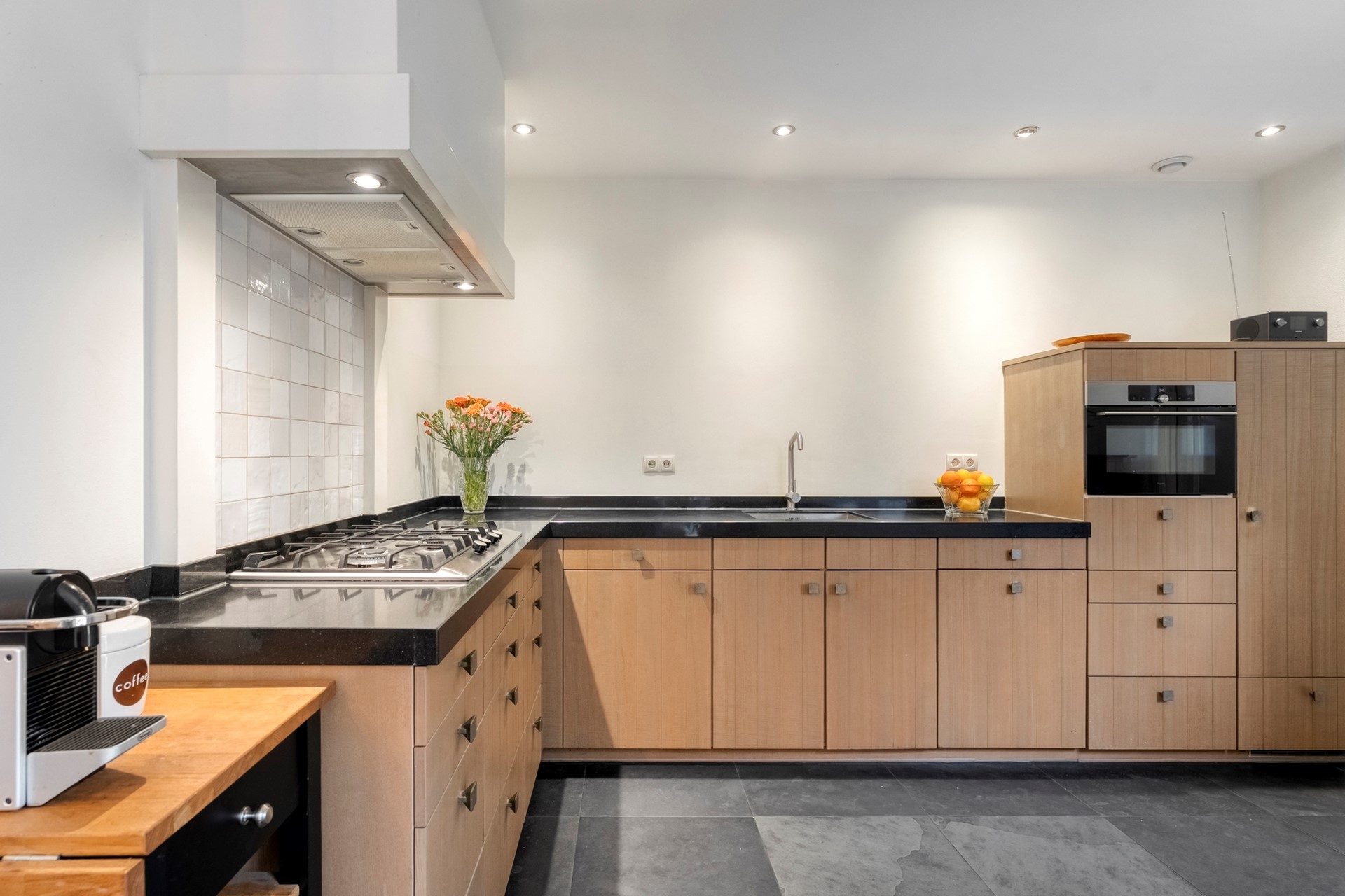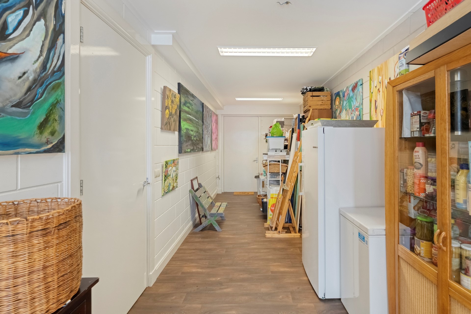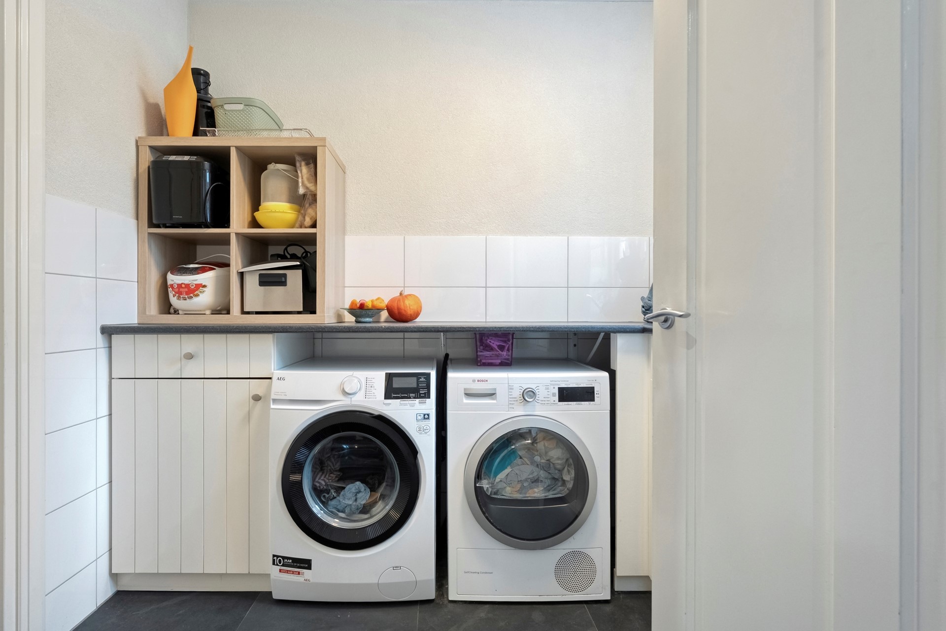 De open keuken is praktisch ingedeeld en uitgerust met diverse inbouwapparatuur, waaronder een vaatwasser, combi-oven, koelkast en een 4-pits gaskookplaat. Vanuit de keuken bereikt u de bijkeuken met was- en droogopstelling. Deze ruimte biedt extra gebruiksgemak en heeft een directe verbinding met de geïsoleerde garage, die niet alleen geschikt is voor opslag, maar ook uitstekend kan dienen als thuiskantoor en/of hobbyruimte.