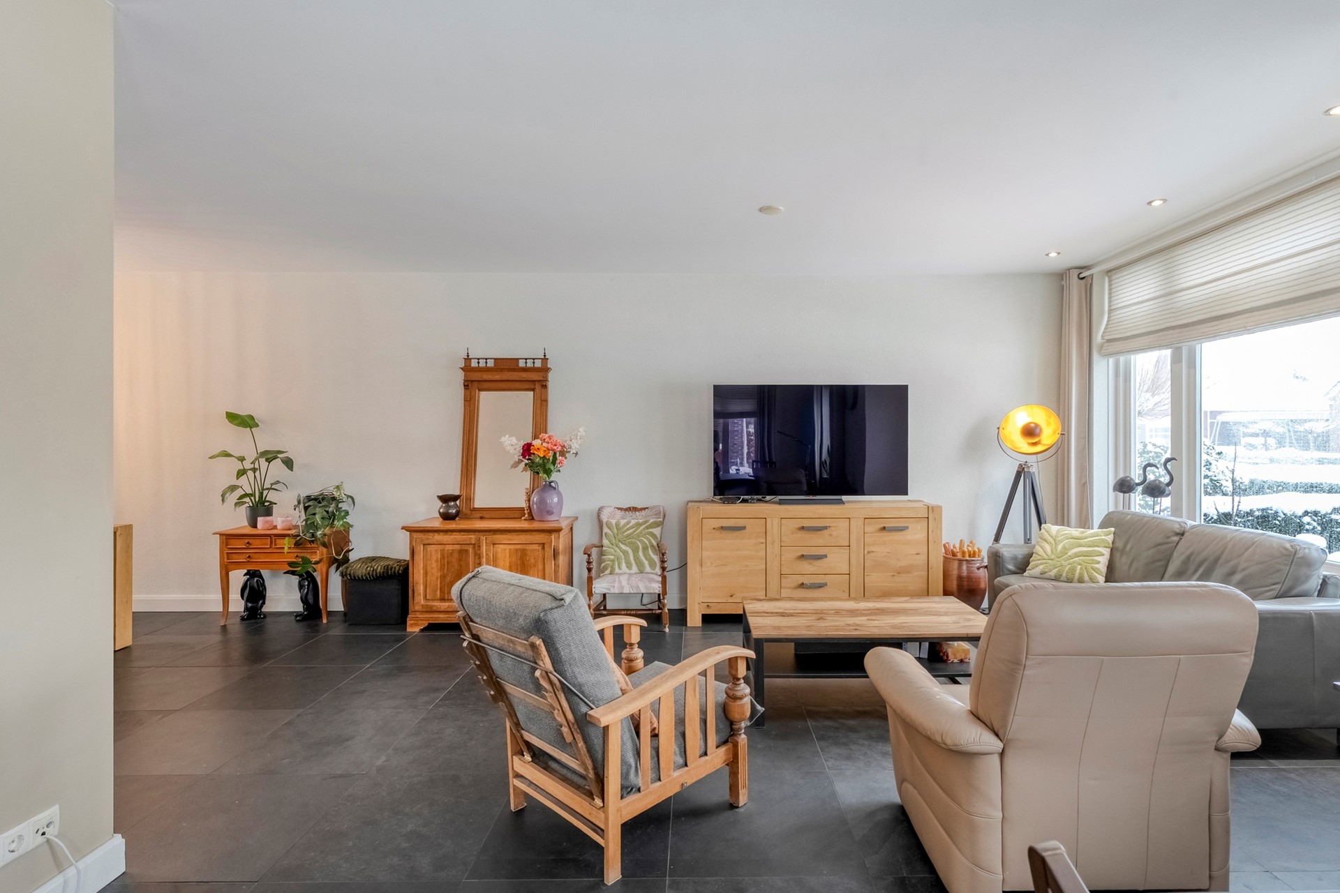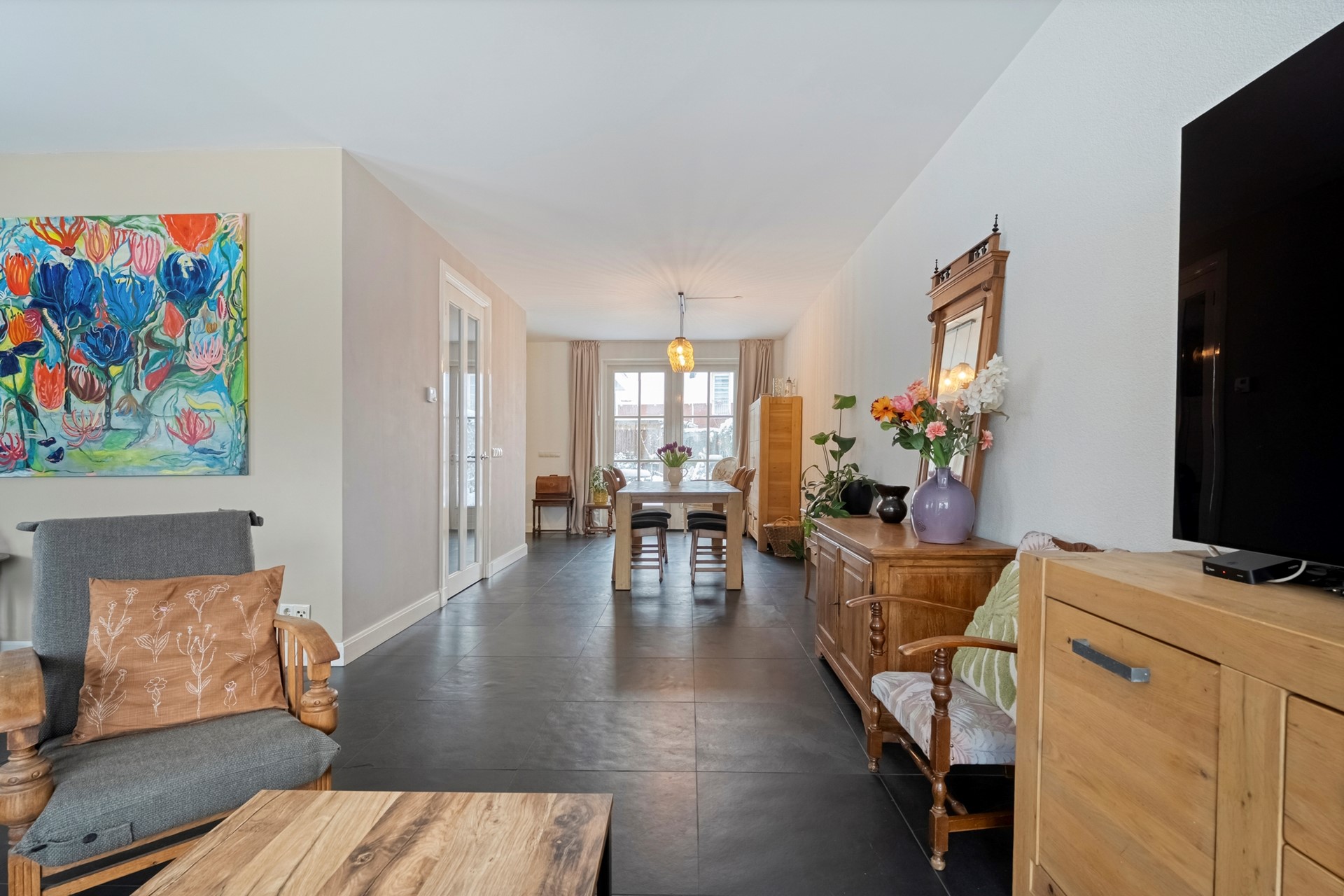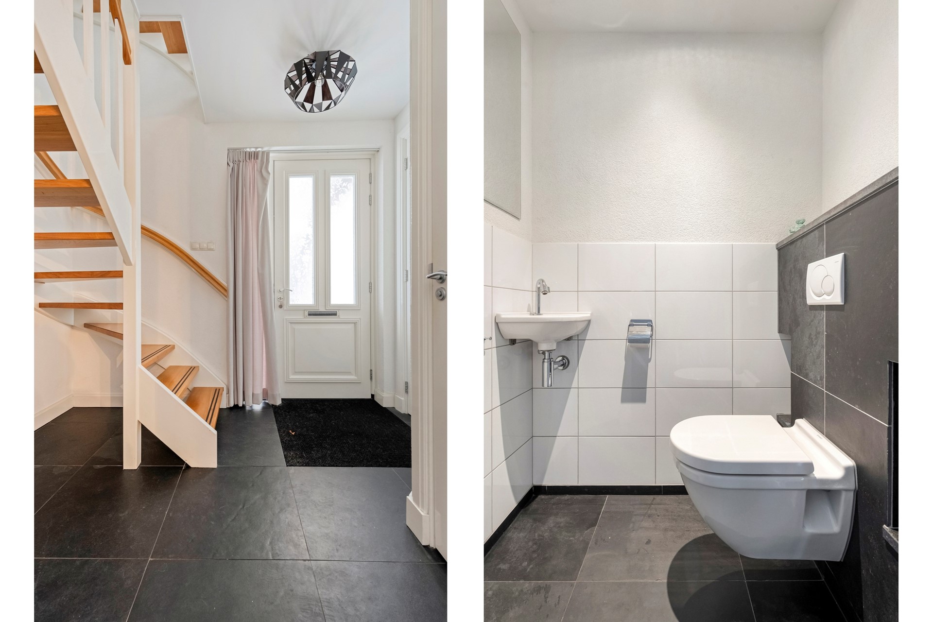 Bij binnenkomst betreedt u een ruime en lichte hal met trapopgang naar de eerste verdieping en een modern toilet voorzien van fontein en een zwevend closet. Vanuit de hal komt u in de sfeervolle woonkamer, die dankzij de grote raampartijen en de openslaande deuren naar het terras een prettige lichtinval heeft en in directe verbinding staat met de tuin.